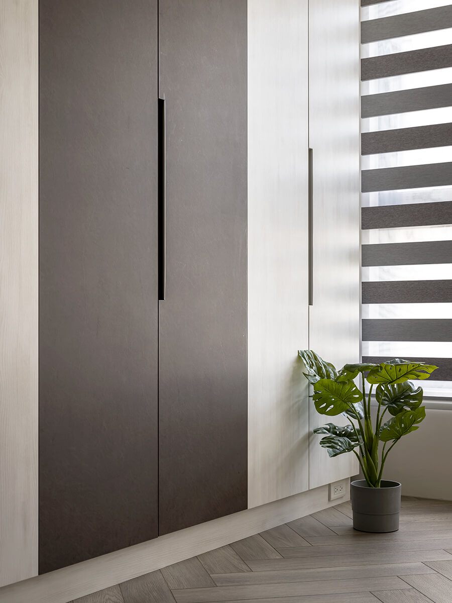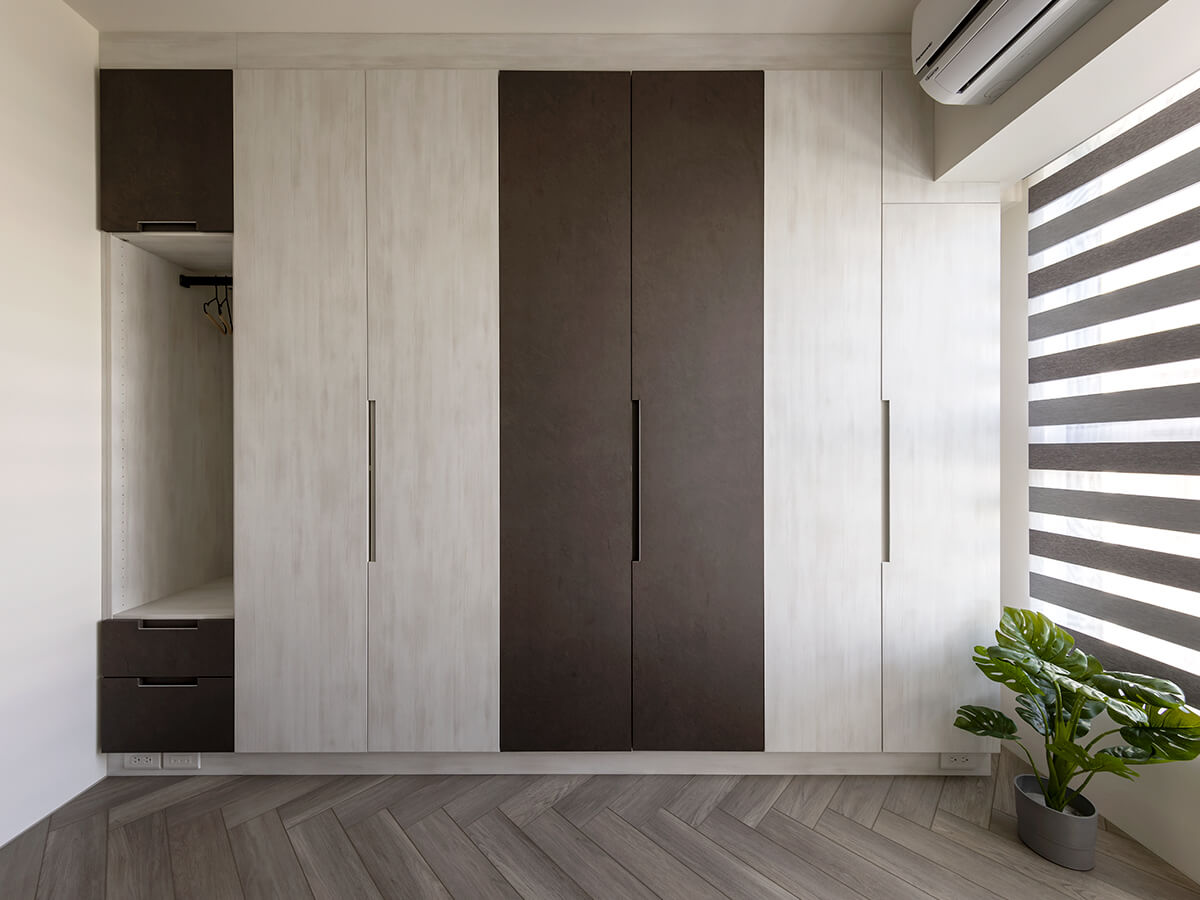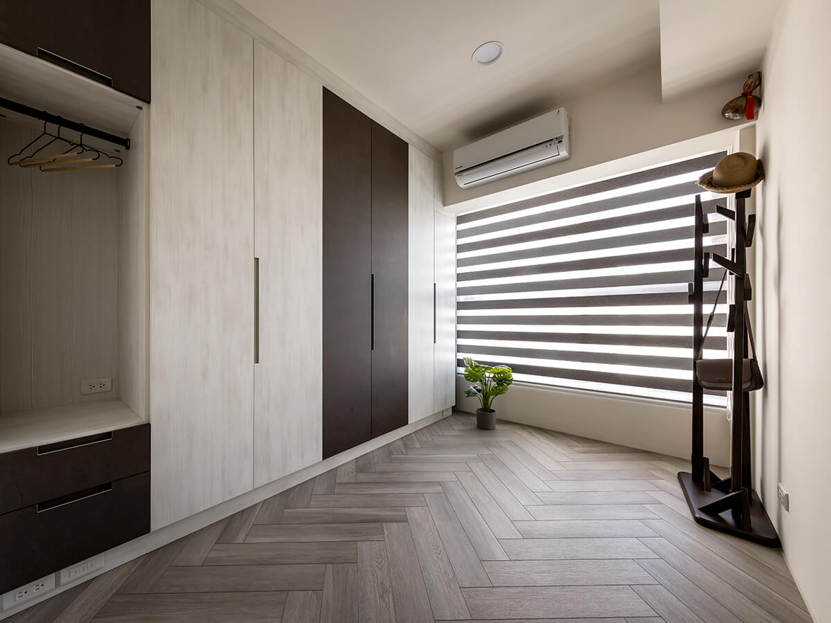 架高的淺咖啡色人字拼地板大剌剌地堆疊至窗台,順著調光捲簾,光源自在地穿梭其間。由沁白與岩褐打造的衣櫃與收納櫃,搭配義大利進口的鋁製尚約把手,大面積的跳色效果,與平釘天花板及人字拼地板形成立體的對比。功能完整的配置,是親友來訪時舒適的休憩空間。