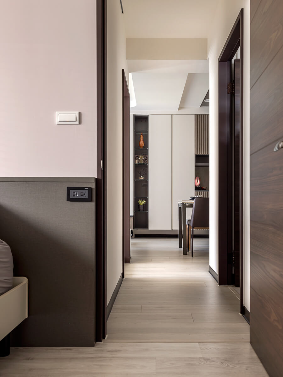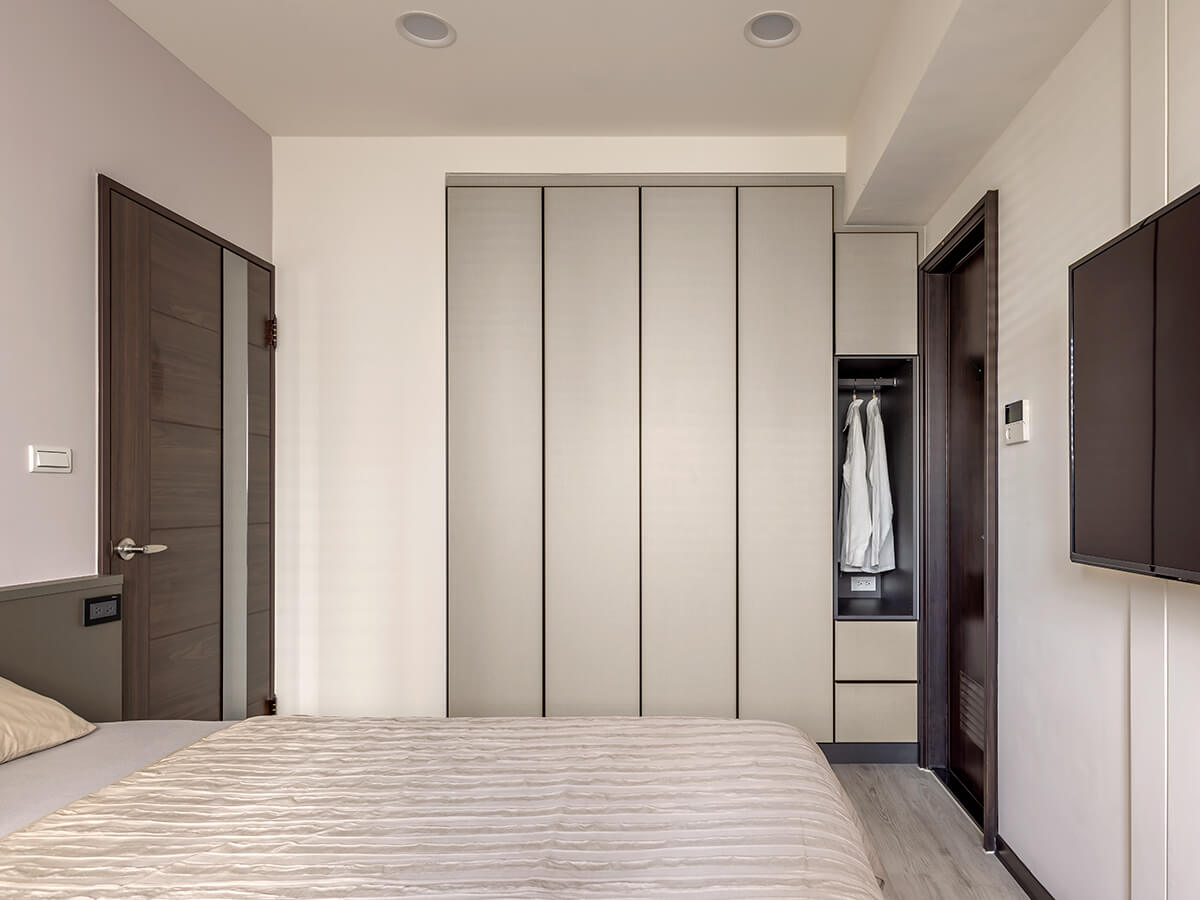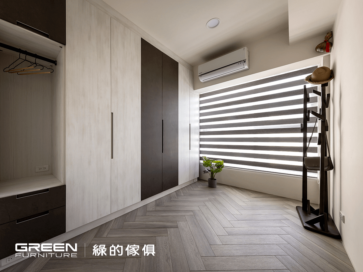 架高的淺咖啡色人字拼地板大剌剌地堆疊至窗台,順著調光捲簾,光源自在地穿梭其間。由沁白與岩褐打造的衣櫃與收納櫃,搭配義大利進口的鋁製尚約把手,大面積的跳色效果,與平釘天花板及人字拼地板形成立體的對比。功能完整的配置,是親友來訪時舒適的休憩空間。