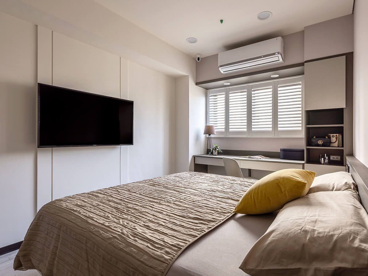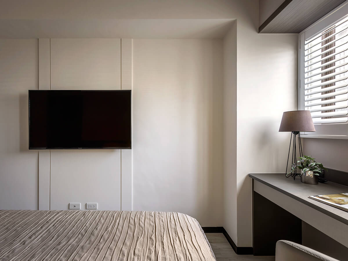 客臥的空間安排在不同色調的穿插下也能井然有序,櫃體以布紋質感的麻紗米搭配溫潤的波爾櫻,與木紋地板有所區隔。下拉式床頭箱可供大型物件收納,連結的書桌與側邊櫃,功能齊全,平日也是完美的書房空間。