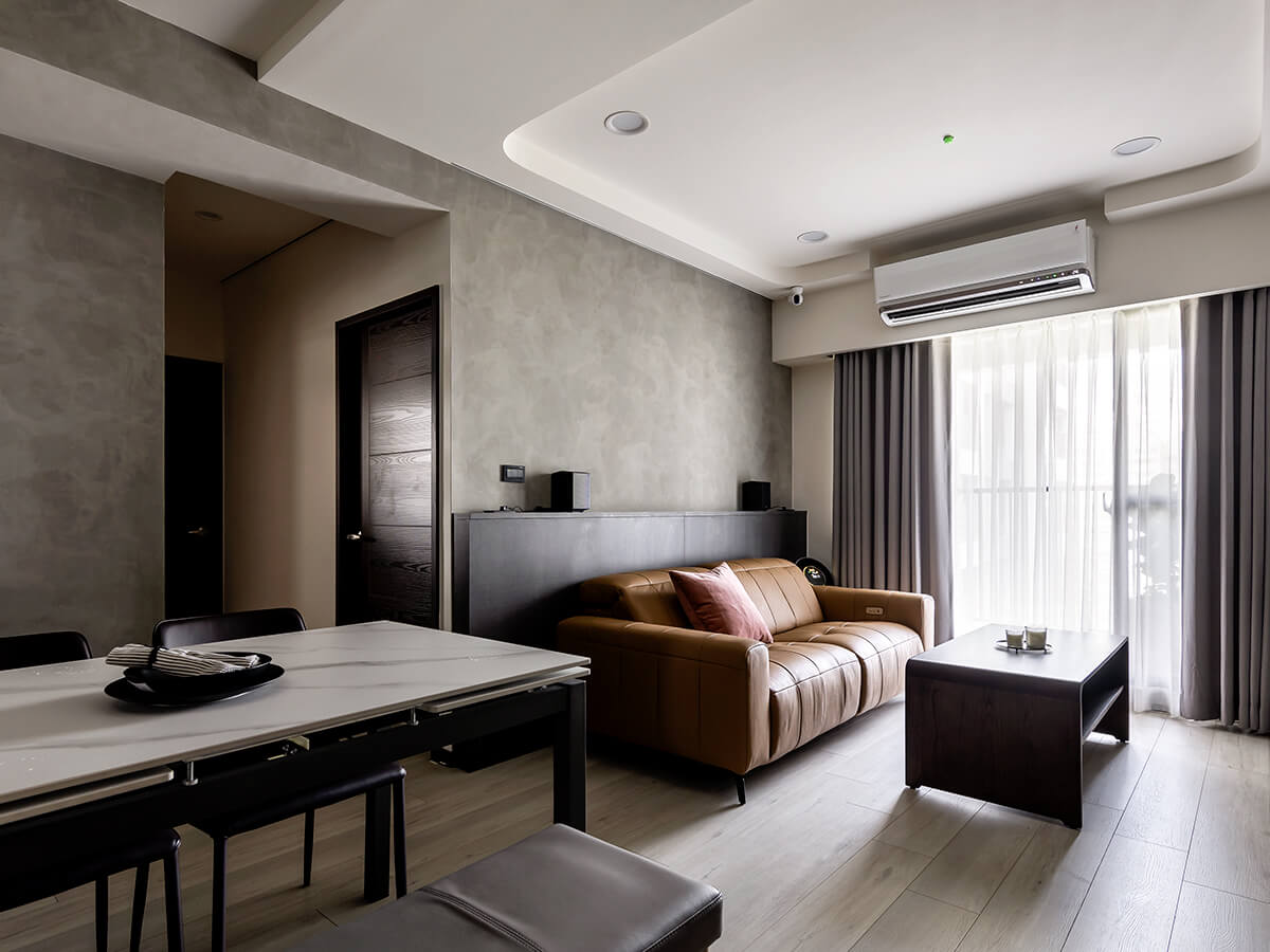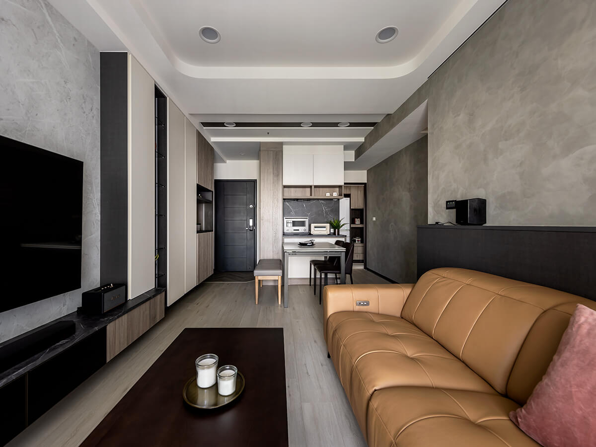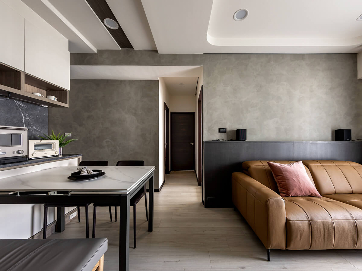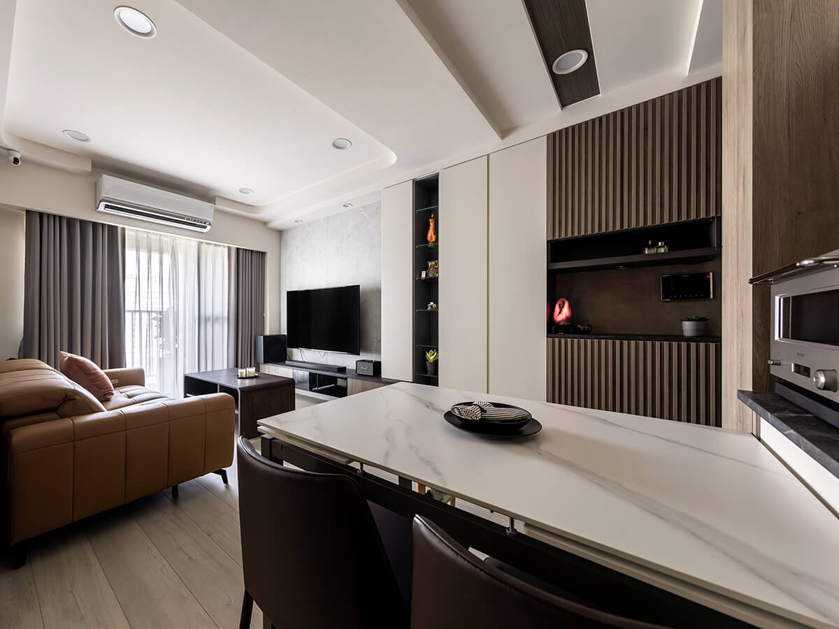 白雲岩的電視牆,是屋主喜歡的沉穩氛圍。下方電視櫃以黑玻搭配布織黑,燈條也捎來間接光,帶著專屬的溫潤。沙發背牆則是藝術漆襯托的布織黑,上方是開放的擺設空間,有著善用空間配置的巧思。
