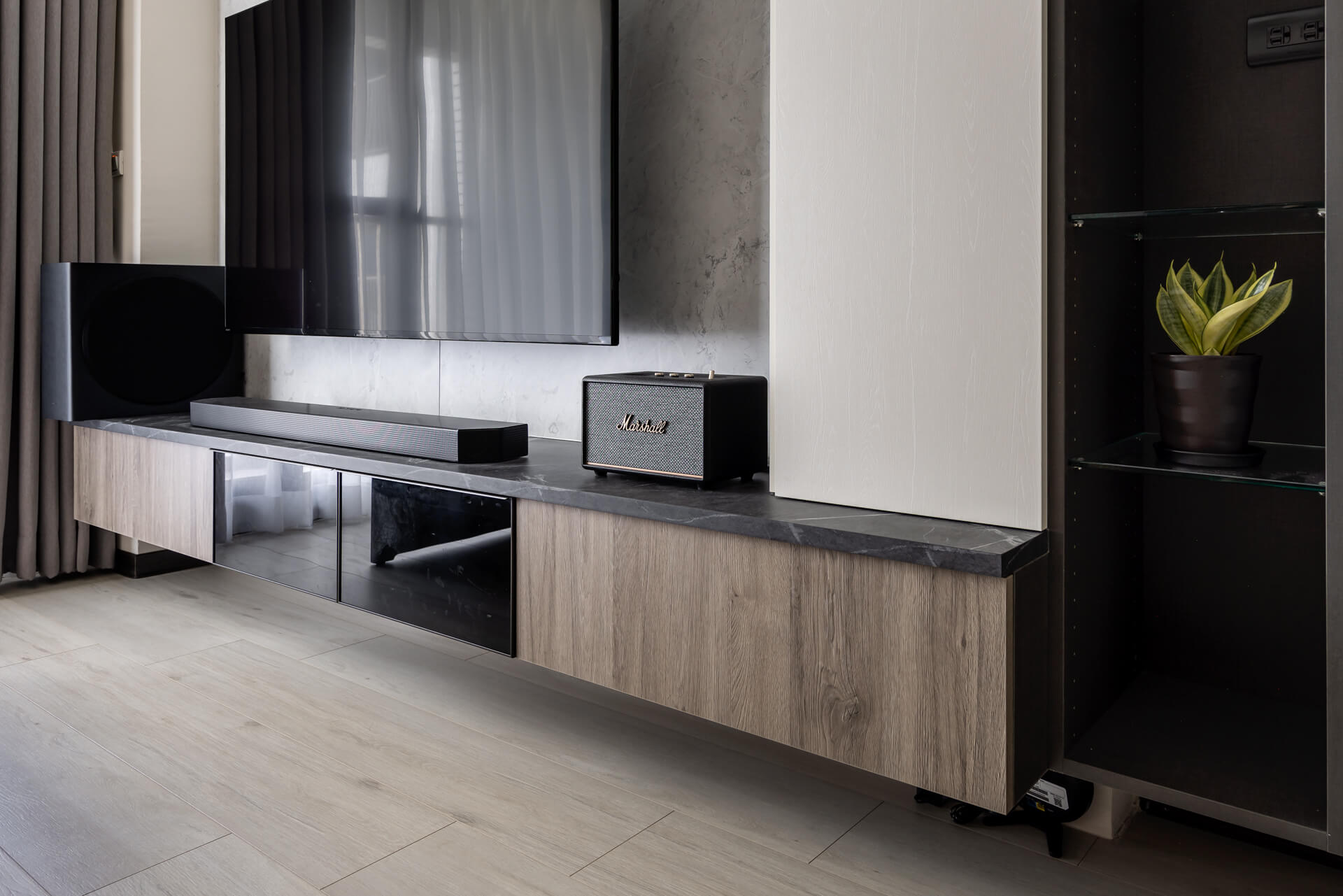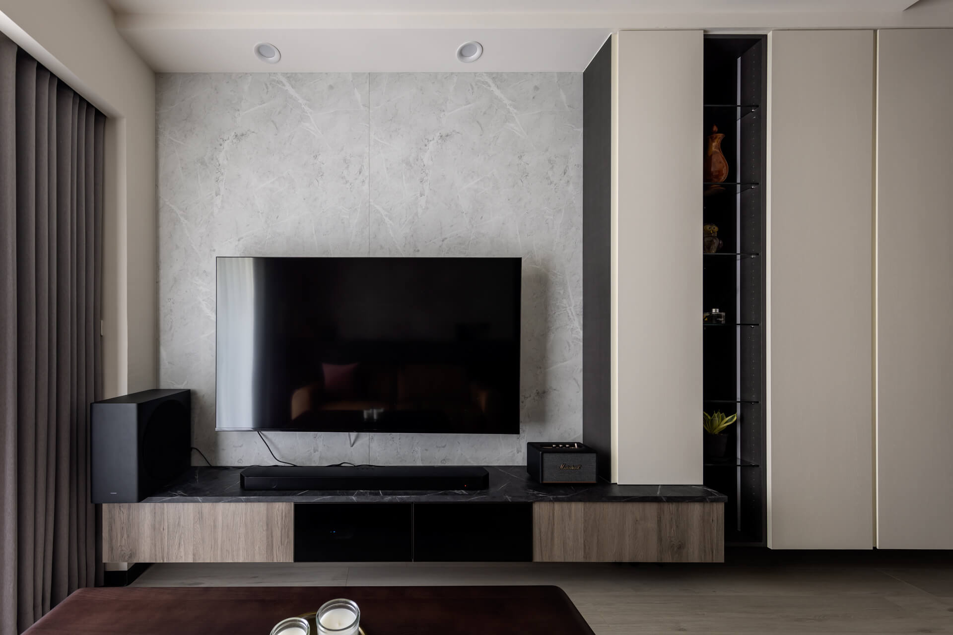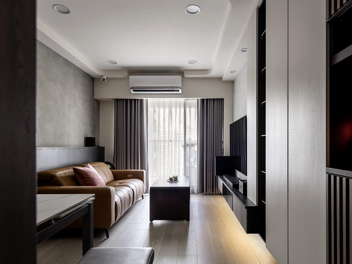 白雲岩的電視牆,是屋主喜歡的沉穩氛圍。下方電視櫃以黑玻搭配布織黑,燈條也捎來間接光,帶著專屬的溫潤。沙發背牆則是藝術漆襯托的布織黑,上方是開放的擺設空間,有著善用空間配置的巧思。