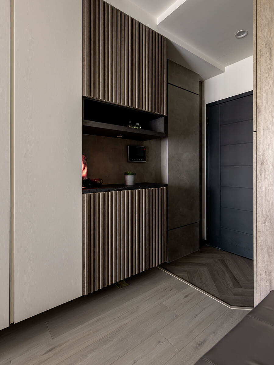 踏入玄關,目光所及盡是一片和諧靜謐,卻又充滿生命力。落塵區錯落有致的人字拼地板是內外的分野,也是屋主的願望清單。黑玻的全身鏡,緩解銳利的反射,又完美地照映出典雅中帶著奢華的一幕。緊鄰的鞋櫃以大小門片搭配史藍丁門片,在不對稱中尋找完美的平衡。