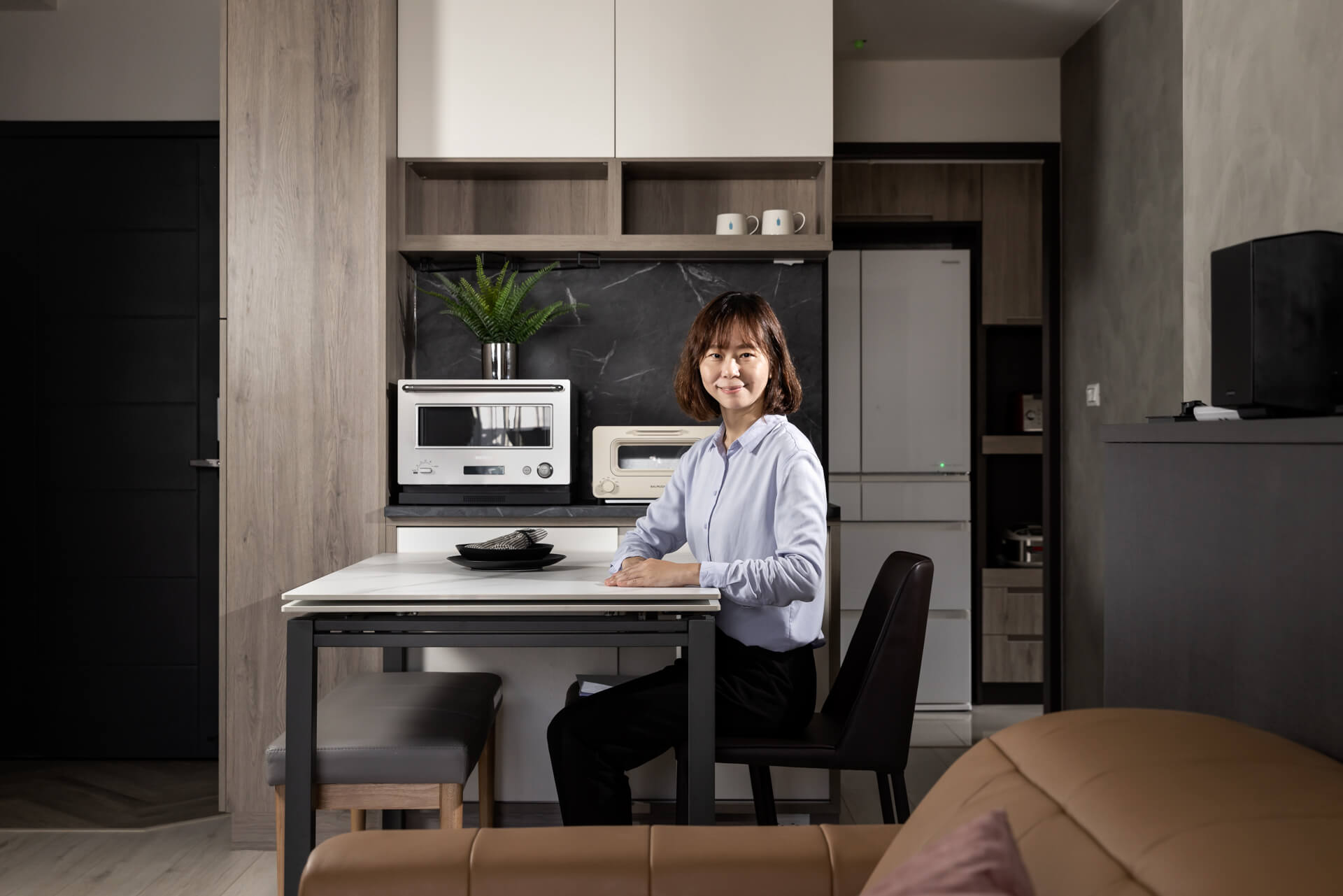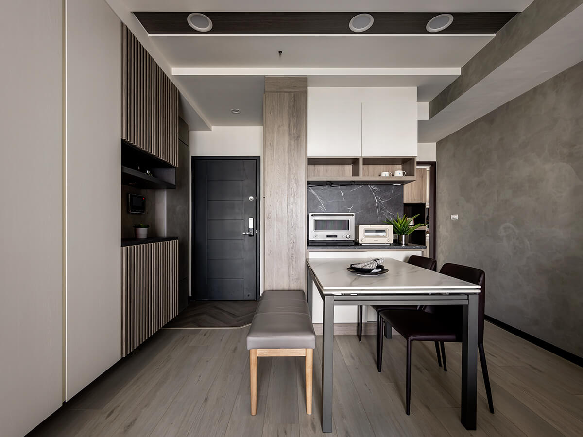屋主在板材與色調的選擇上較為大膽與多元,給設計師的需求也很明確。偏好深色,卻又少不了淺色點綴;深淺交織的跳色,透過光線襯托櫃體,柔化櫥櫃的存在,也讓室內的節奏更為鮮活。