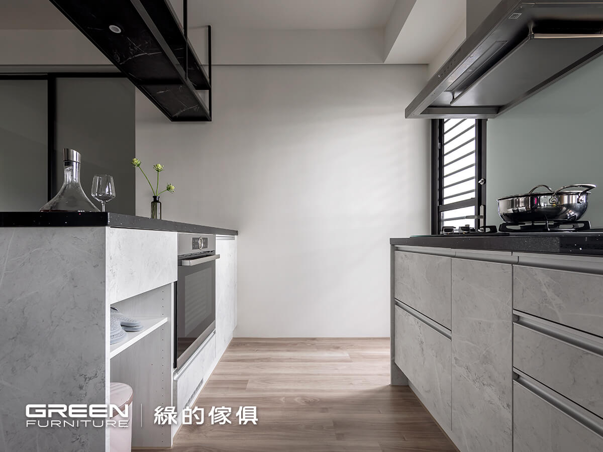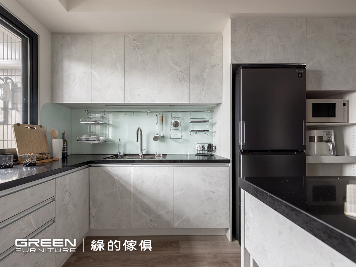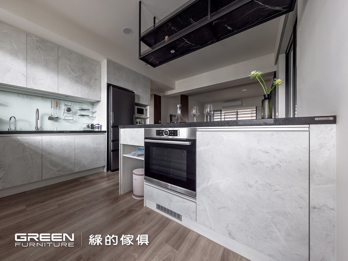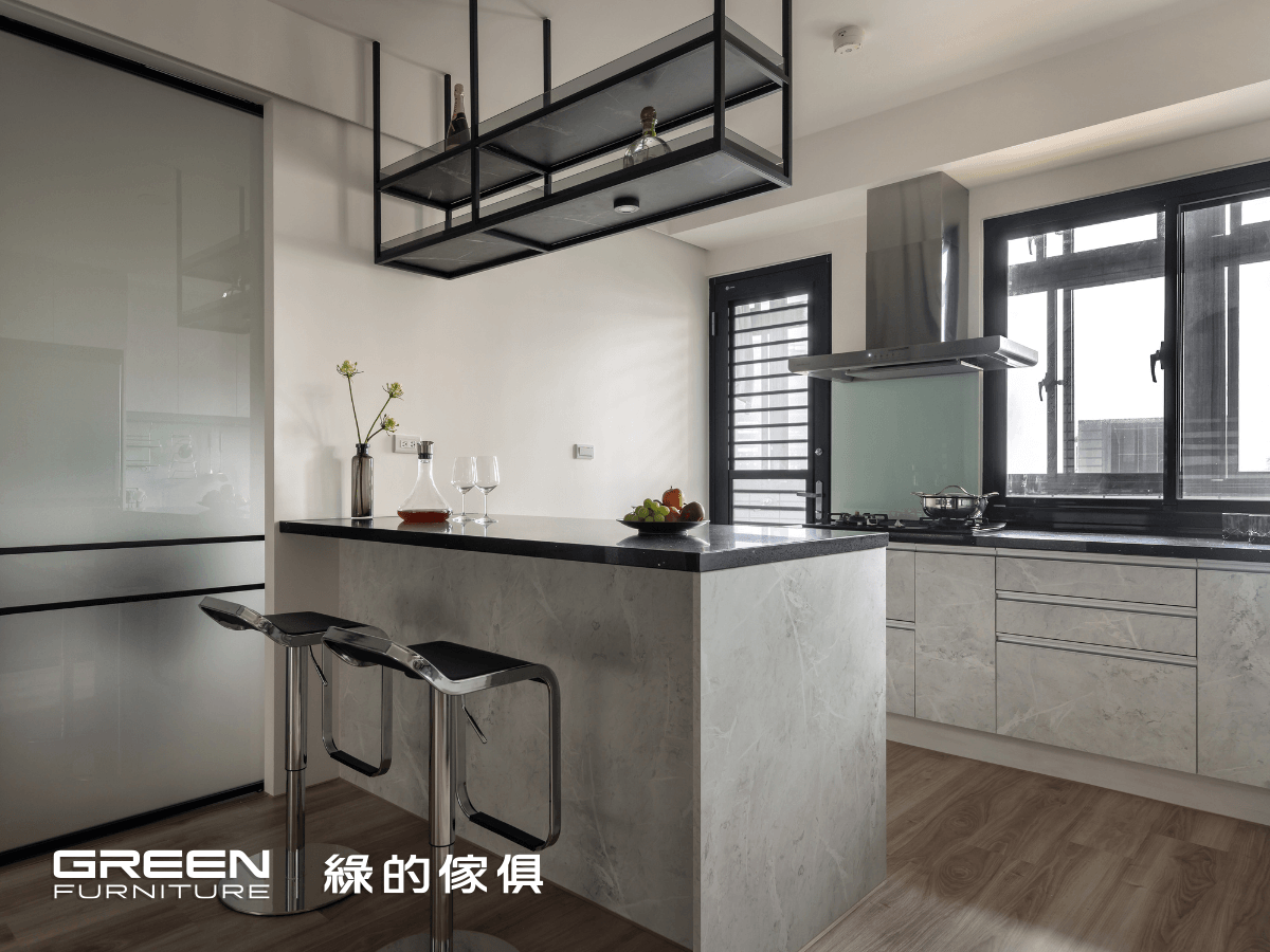 流理台下方選用了白雲岩系統板材,與黑色石英石面板形成美麗對比,營造出現代簡約風格。中島也採用相同的材質設計,並搭配鐵件吊櫃,讓整個廚房空間顯得更加和諧,功能性與美觀兼具。這樣的 舊屋翻新廚房設計,不僅完美滿足了屋主對空間的需求,還讓每個愛烹飪的人都能擁有屬於自己的理想廚房。