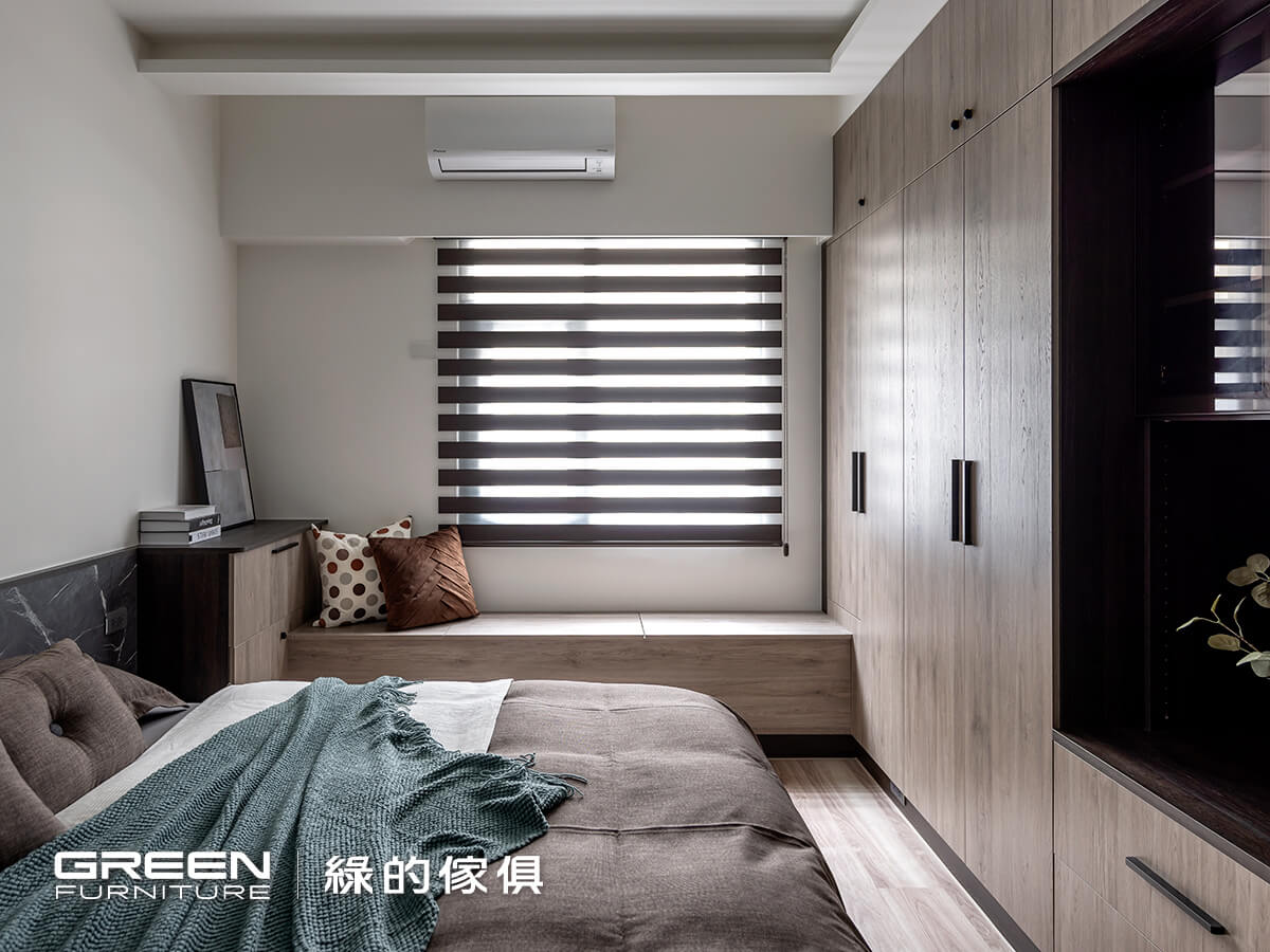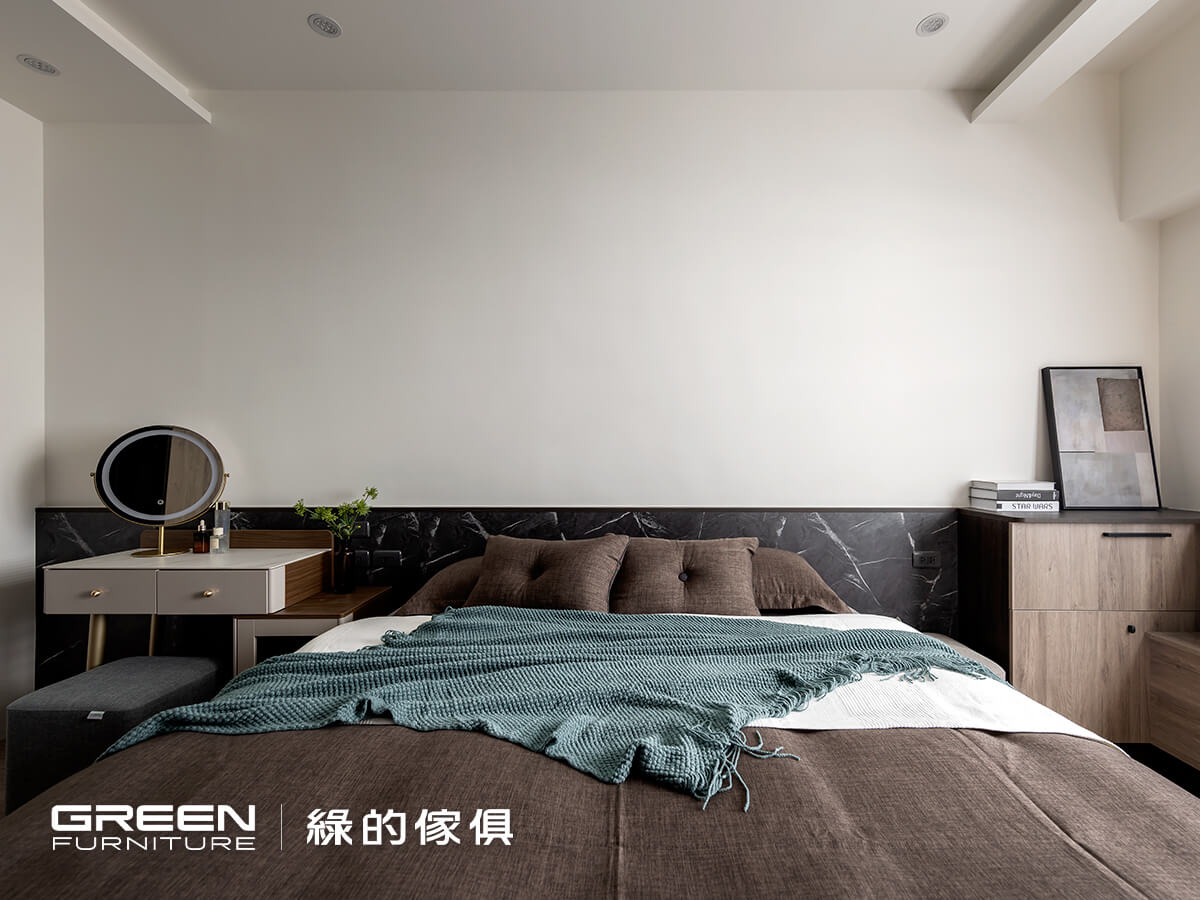 臨窗規劃的臥榻區,延續深色木紋理,將自然質感引入生活角落,無論是閱讀、放空,或只是靜靜看著窗外,都成為日常最剛好的停留點。床頭則以黑雲岩系統板材作為視覺主牆,與臥榻相互呼應,讓整體主臥空間在視覺上更顯方正、穩定。