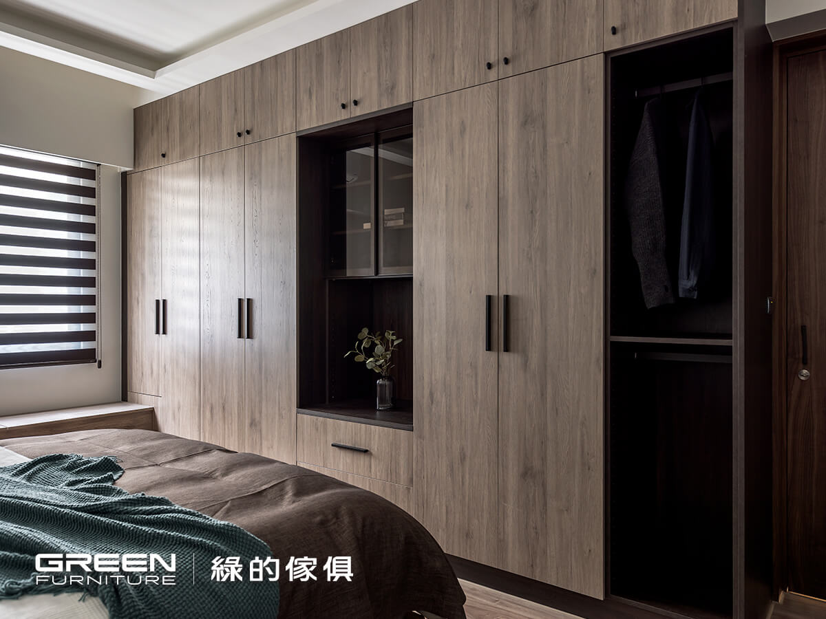衣櫃規劃,選用深色木紋搭配簡約新合金烤漆門把,在沉穩之中保留俐落細節。局部加入簍空設計,減輕量體感受,也讓收納櫃不再只是封閉的牆面,而是成為空間的一部分。這正是系統傢俱在室內設計中最關鍵的角色——不只解決收納,更要顧及比例、光感與長時間居住的舒適度。