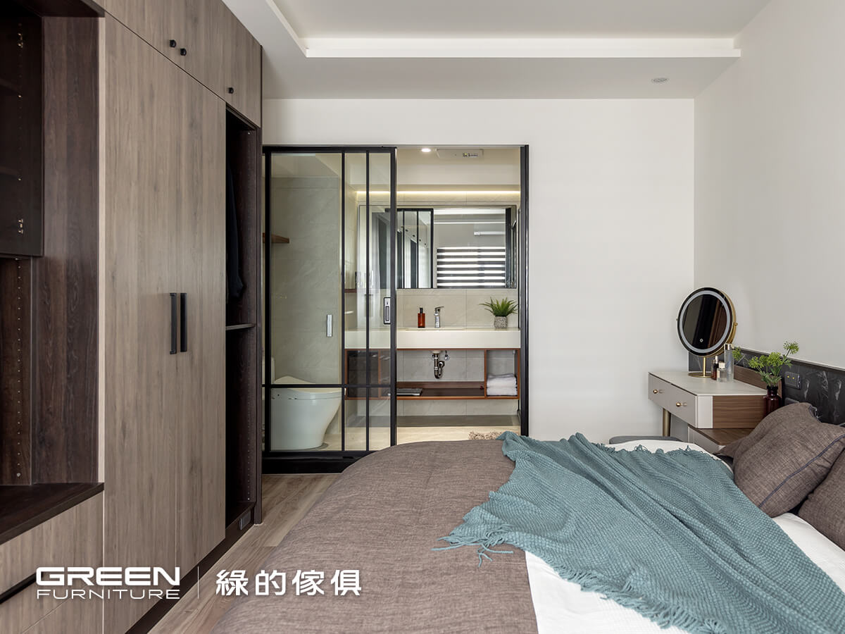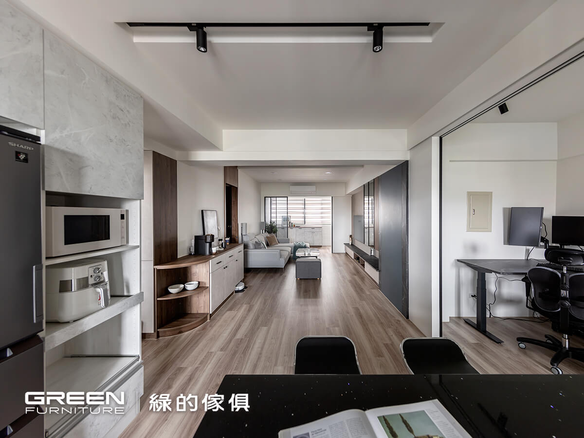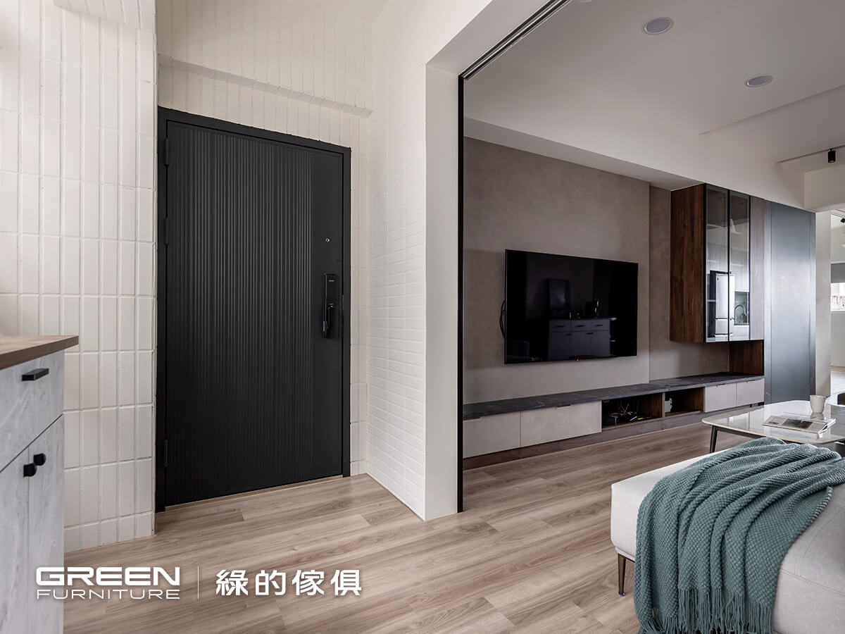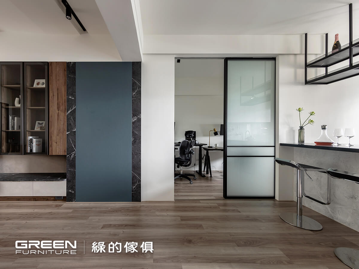 深色鋁框推拉門,讓空間在開放與獨立之間自由切換。透過系統傢俱整合規劃,使整體視覺一致延伸,低調卻耐看。這正是綠的傢俱在舊屋翻新室內設計中,最在意的生活平衡。