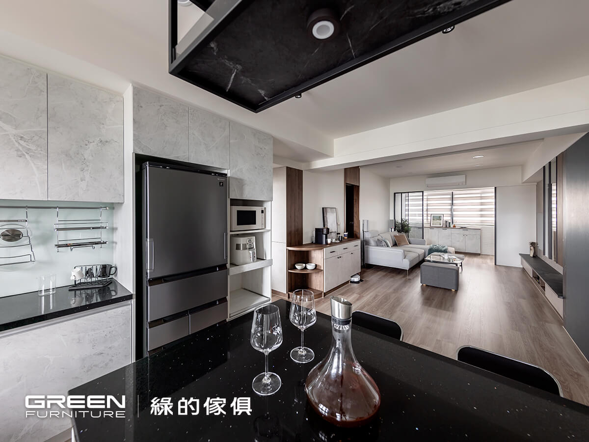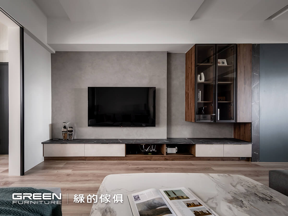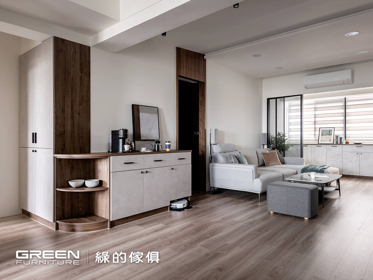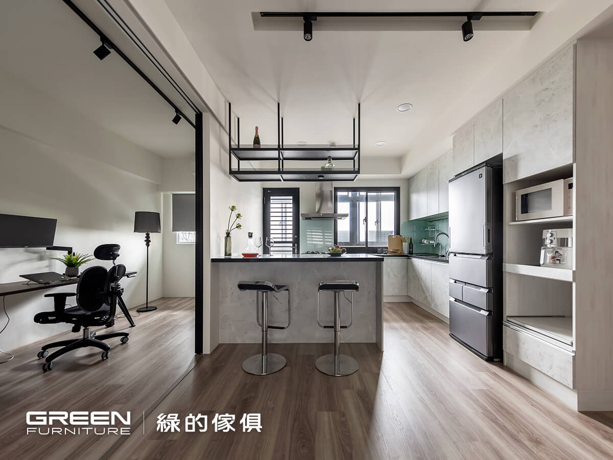 深色鋁框推拉門,讓空間在開放與獨立之間自由切換。透過系統傢俱整合規劃,使整體視覺一致延伸,低調卻耐看。這正是綠的傢俱在舊屋翻新室內設計中,最在意的生活平衡。