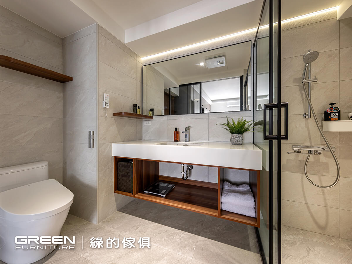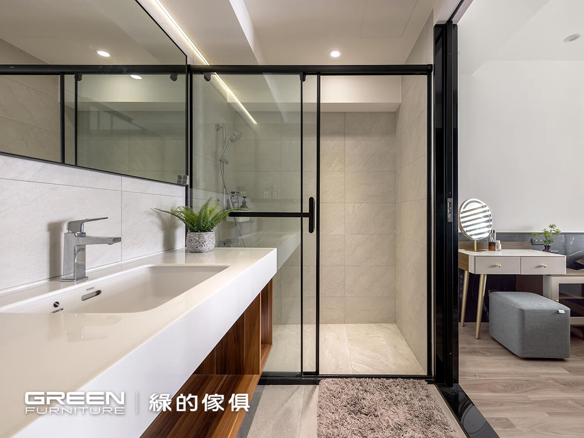 隱藏門後方,是重新配置的大尺度浴室區域。以玻璃推拉門搭配黑色鐵件包框作為界定,不僅保有視覺穿透感,也悄悄注入一點低調的工業風設計語彙。牆面與地坪選用灰色系磁磚,讓整體氛圍回歸現代簡約,線條俐落卻不冰冷。