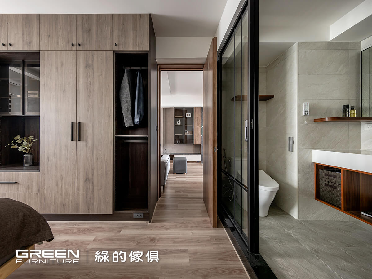 屋主形容自己是裝修上的菜鳥,有些天馬行空的想法,但設計師卻很有耐心。他剛開始的目標包括更衣室,但對原來狹長的主臥來說空間很小。因此在設計師的建議下做了更動,也對調整過後的主臥格局相當滿意。他特別提到「綠的傢俱」五金等配件的品質讓他很驚訝,除了功能性強,效果也很好;而3D圖的擬真程度也讓他十分讚賞。屋主也給同齡的年輕人建議,首購不一定要著重在新屋或預售屋,舊屋翻新也能讓你達到擁有新家的目的,相對壓力也不會那麼大。他也特別強調:「要勇敢去溝通,但一定要保持開放的態度,並尊重專業。」