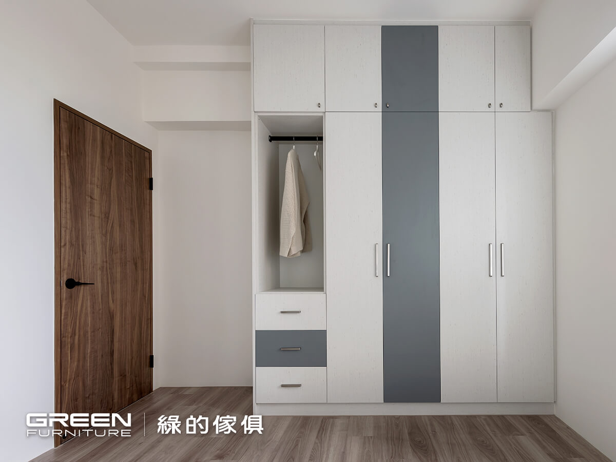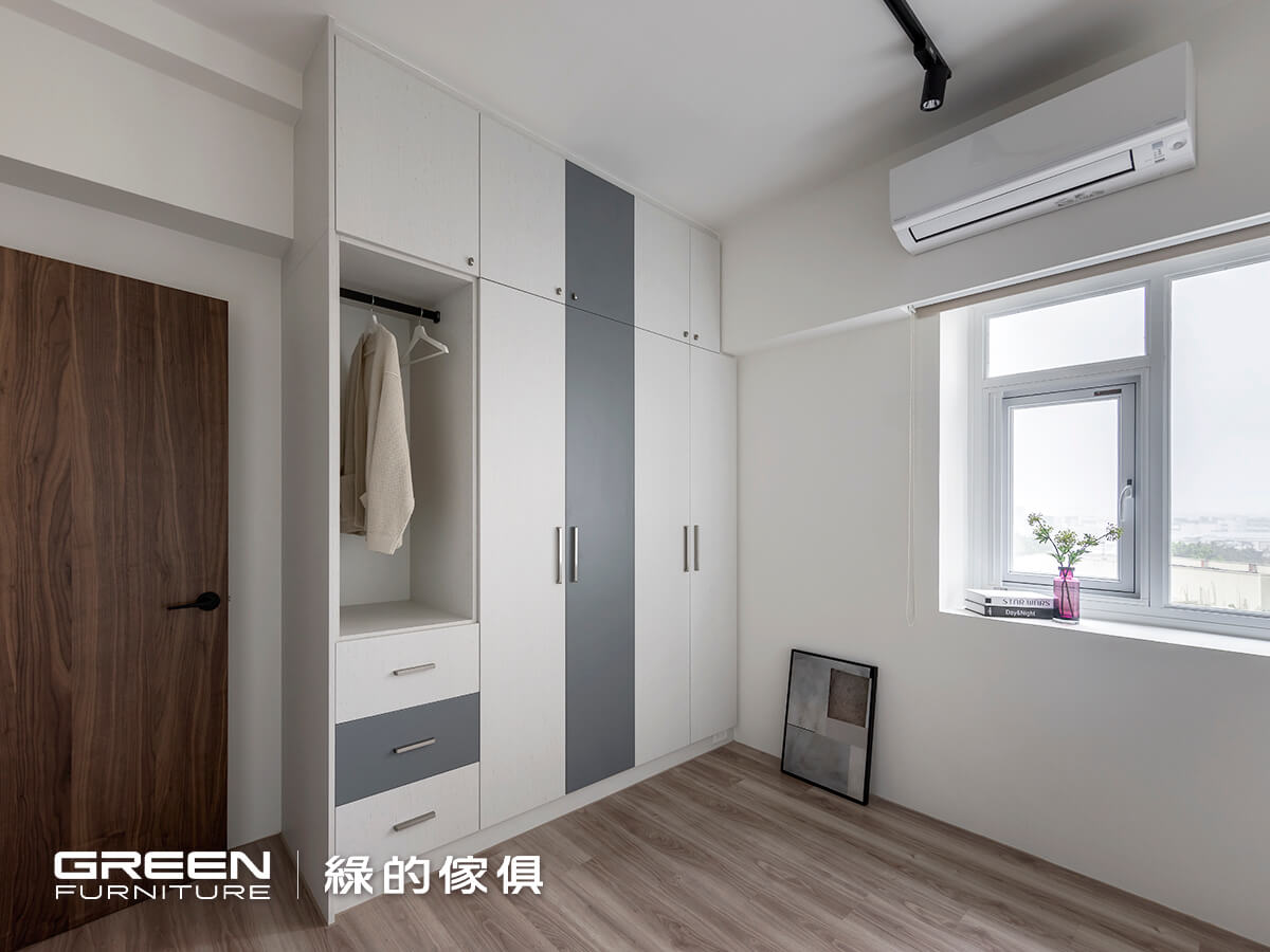 清麗的麻紗米衣櫃點綴著與主臥同款的淡色系把手;偶來的灰藍跳色,更顯落落大方。明亮的大面窗與挑高的軌道燈,襯得整體空間更顯開闊。
