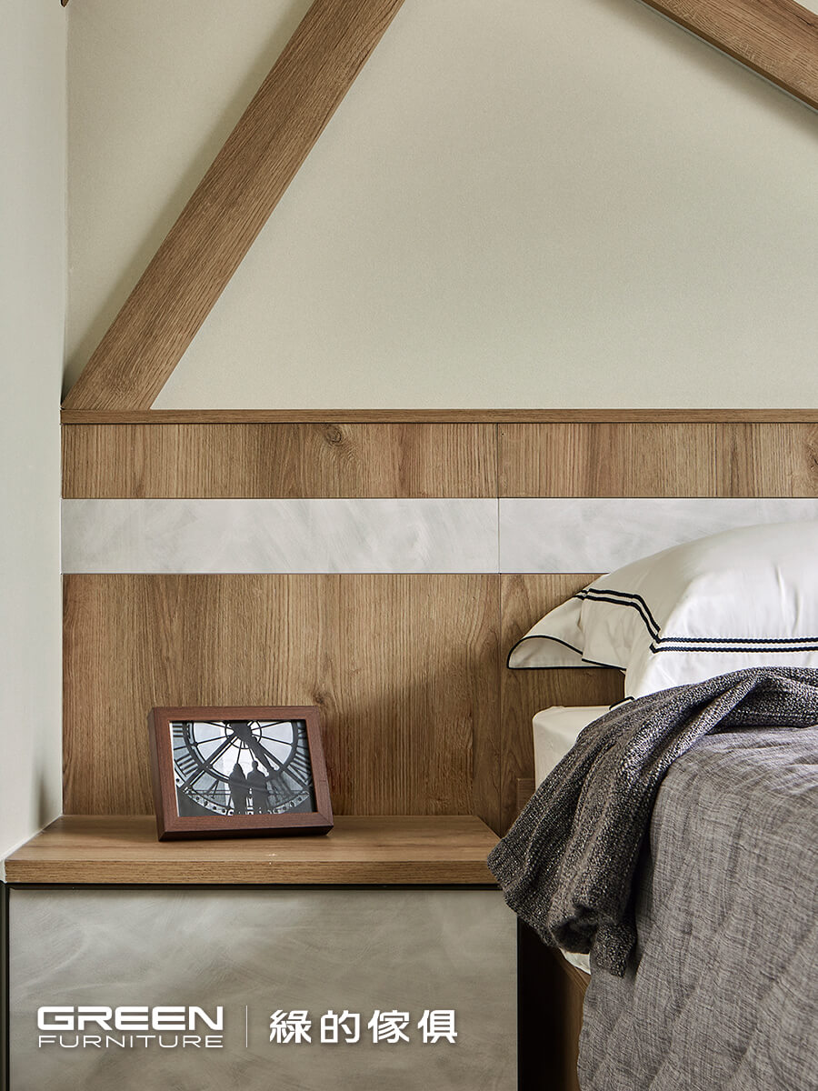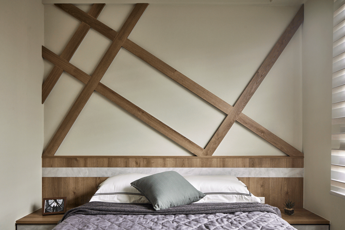 設計師為了營造日式靜謐又不失個人特色的起居,選用低彩度素雅的核橡木紋為主色, 米色的硅藻土壁紙牆面與調光簾所注入的光影,讓睡眠空間簡單乾淨又不失溫度;床頭的背景牆出自設計師親自打造,俐落交錯的木紋理線條,於每個板材後面設邊條燈取代主燈,以光影、輕淺色彩交織而成簡約的獨一無二人文氣息,完美演繹生活禪空間美學。