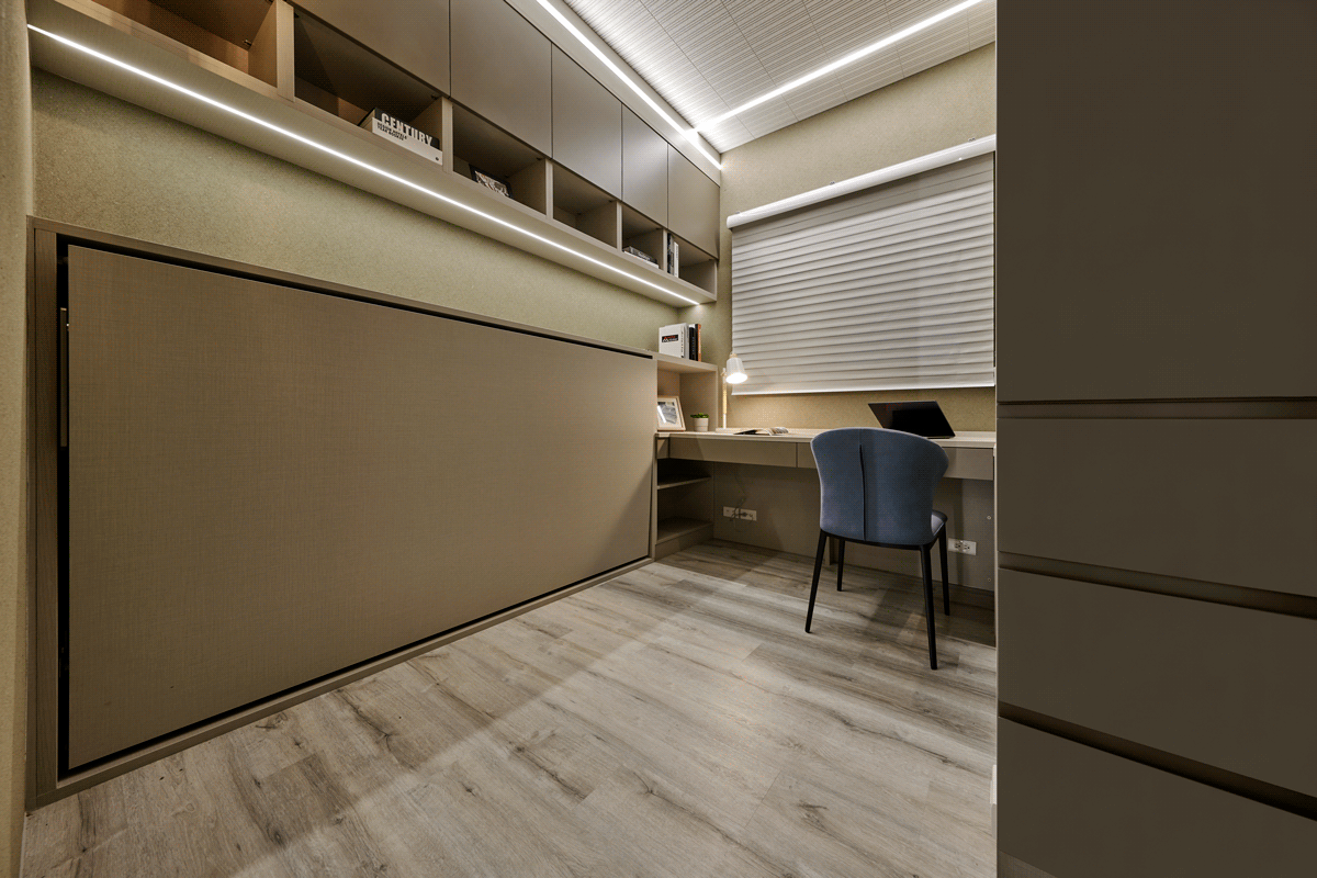 更特別的是,書桌區融入隱形壁床設計,在需要時能夠輕鬆拉出作為客房使用,平時則隱藏在系統櫃中,毫無突兀感。這樣的系統傢俱配置不僅機能多元,也讓有限的坪數發揮最大效益,是現代住宅中極具彈性的空間解決方案。