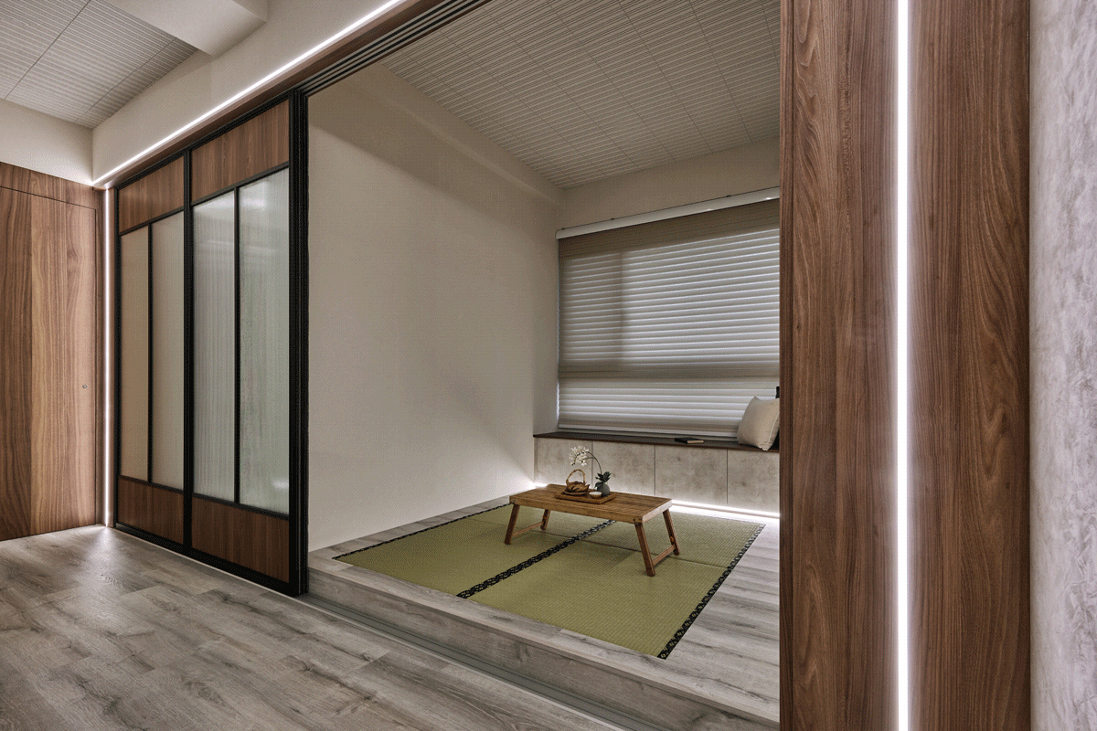 地板鋪上擁有淡雅青草香的淺綠色塌塌米,與周圍的木紋地板形成溫潤對比,不僅讓整體空間更具和風氛圍,也展現出主人家對細節的講究與品味。這樣的配色與材質運用,是許多尋求和風室內設計靈感的屋主首選。