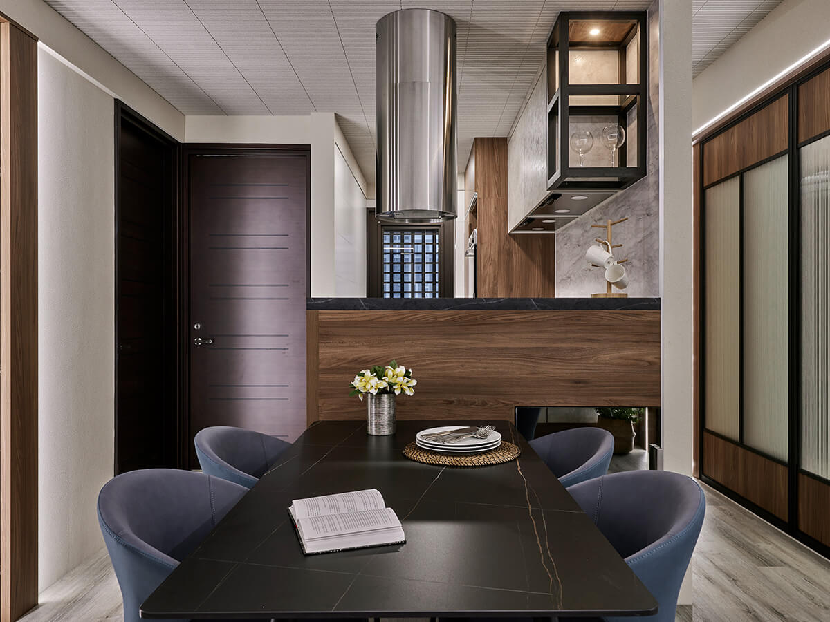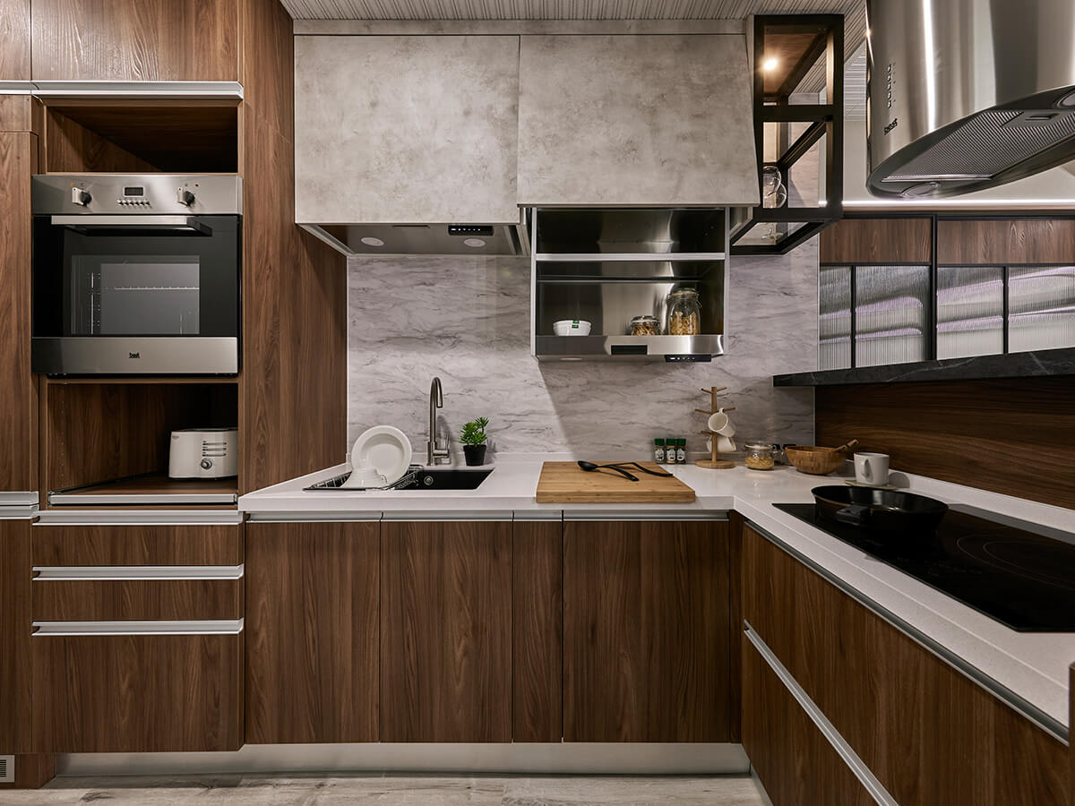 緊黏餐桌的是高吧檯與廚房櫃體結合的半開放設計,不僅可以當作送餐平台使用,也能作為廚房與客、餐廳之間的隱形隔斷,增加整體的開闊感,為了彌補L型廚房動線及收納的問題,設計師巧秒使用崁入式的電器,大幅提升廚房的機能性及便利度,上方設有升降型的崁入式烘碗機以及櫥櫃,免搬椅就能輕鬆拿取較高的物品,並設置崁入式的冰箱完美與系統櫃體合而為一,讓整體廚房空間更為和諧一致,搭配硬度高且耐刮磨、耐熱的賽麗石工作檯面,就算天天使用也不容易有損壞,整個櫃體顏色以波爾櫻木紋及雲彩白石紋,形成上白雲下大地的顏色組成,讓餐廚空間回歸到最自然的美感。