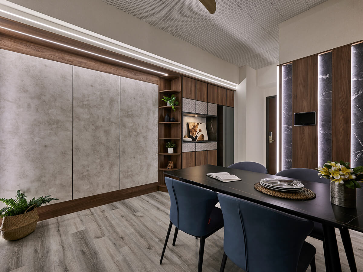 進屋往左就能看到勞倫黑金岩板餐桌點綴整個餐廚空間,岩板餐桌除了有耐高溫、耐刮等特性,日常清潔也僅需使用濕毛巾擦拭,帶著金色流利線條的黑岩板餐桌,與整室自然設計元素相襯,打造主人的輕奢好食光。