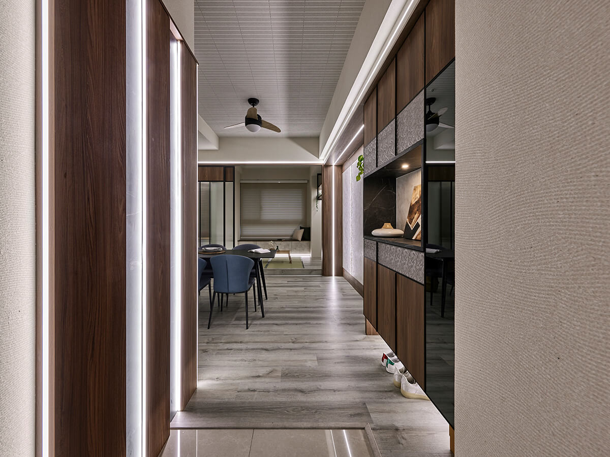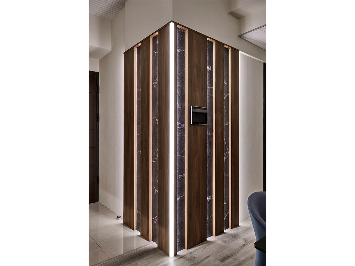 進門左側以日式格柵窗為設計靈感,波爾櫻木紋與黑雲岩石紋交錯搭配,營造出簡約高雅的玄關氛圍。格柵中嵌入邊條燈帶,不僅解決了無主燈的照明問題,也增添玄關的層次與設計感。右側鞋櫃採用系統櫃懸空設計,有效減輕視覺負擔,下方空間方便擺放拖鞋或剛進門的鞋子透氣收納,既美觀又實用。