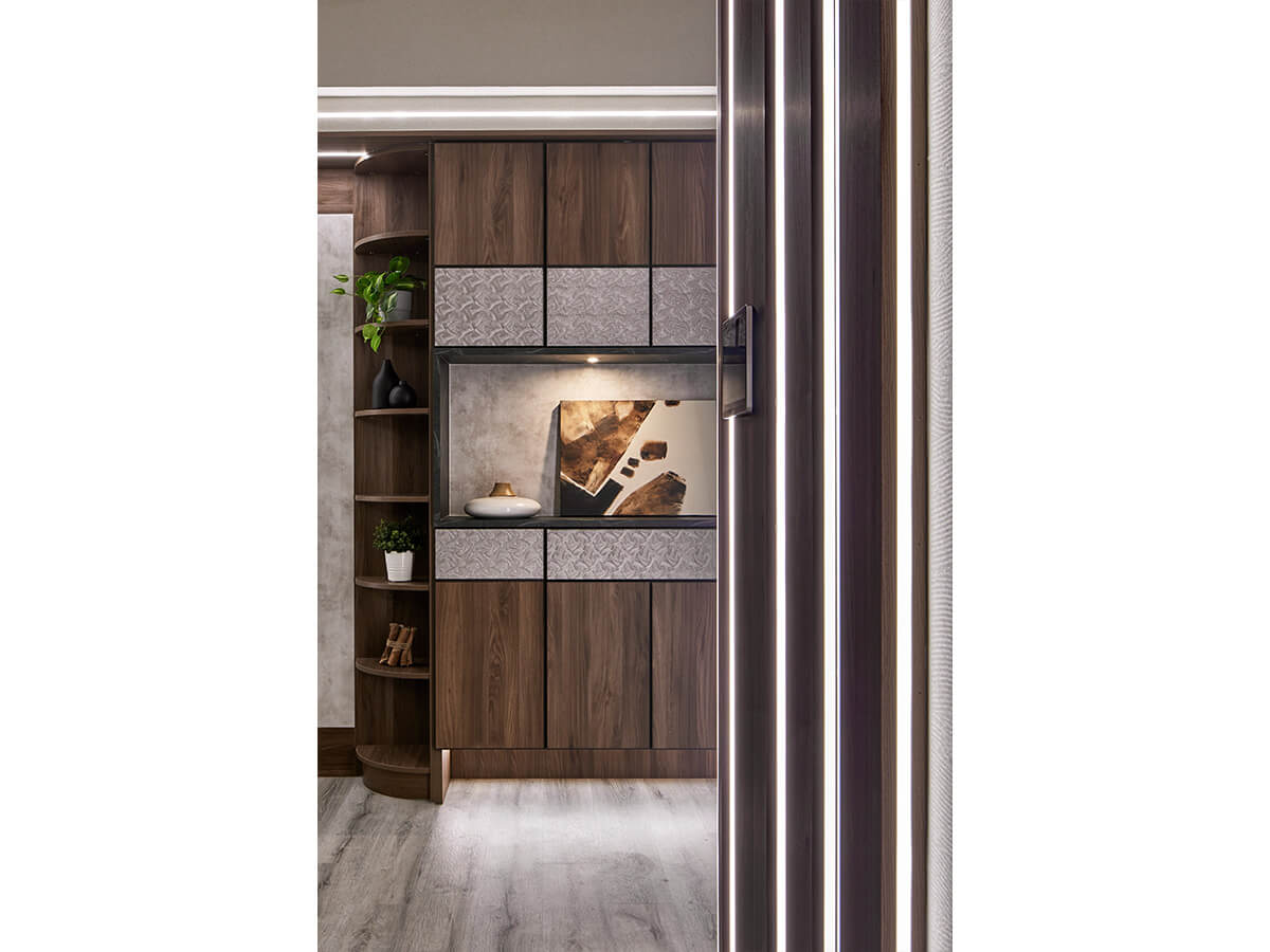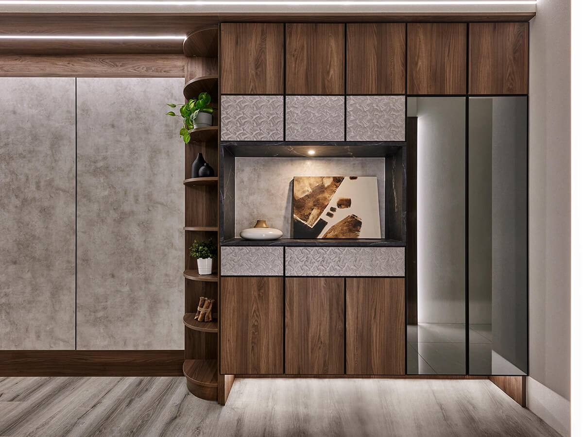 鞋櫃側邊設置穿衣鏡,方便出門前整理儀容,同時達到放大空間的視覺效果。整體玄關櫃體皆採用高質感的系統傢俱設計,延續波爾櫻木紋板材搭配咖啡鋁框五金與澤葉銀的特殊紋理,一路延伸至客廳主牆。