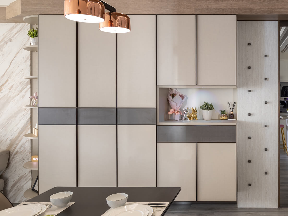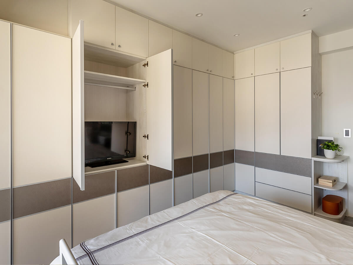 陳憲志匠心獨運,善用主臥室邊樑底下的畸零空間,設計出靠牆獨立的橫幅ㄇ字形衣物櫃空間兼穿衣間,安裝有拉門,早起著裝也不會吵到還在沈睡的另一半,體貼入微;另一個畸零空間位於大廳通往主臥室的邊角,背面其實是小公主房,陳憲志並不像一般施工的作法,直接打掉,而是用心構思,美化變成有收納櫃的儲藏間,超大行李箱直接推入置放,有圖紋的木作拉門一關上,就融入走道當中,根本猜不出玄機。