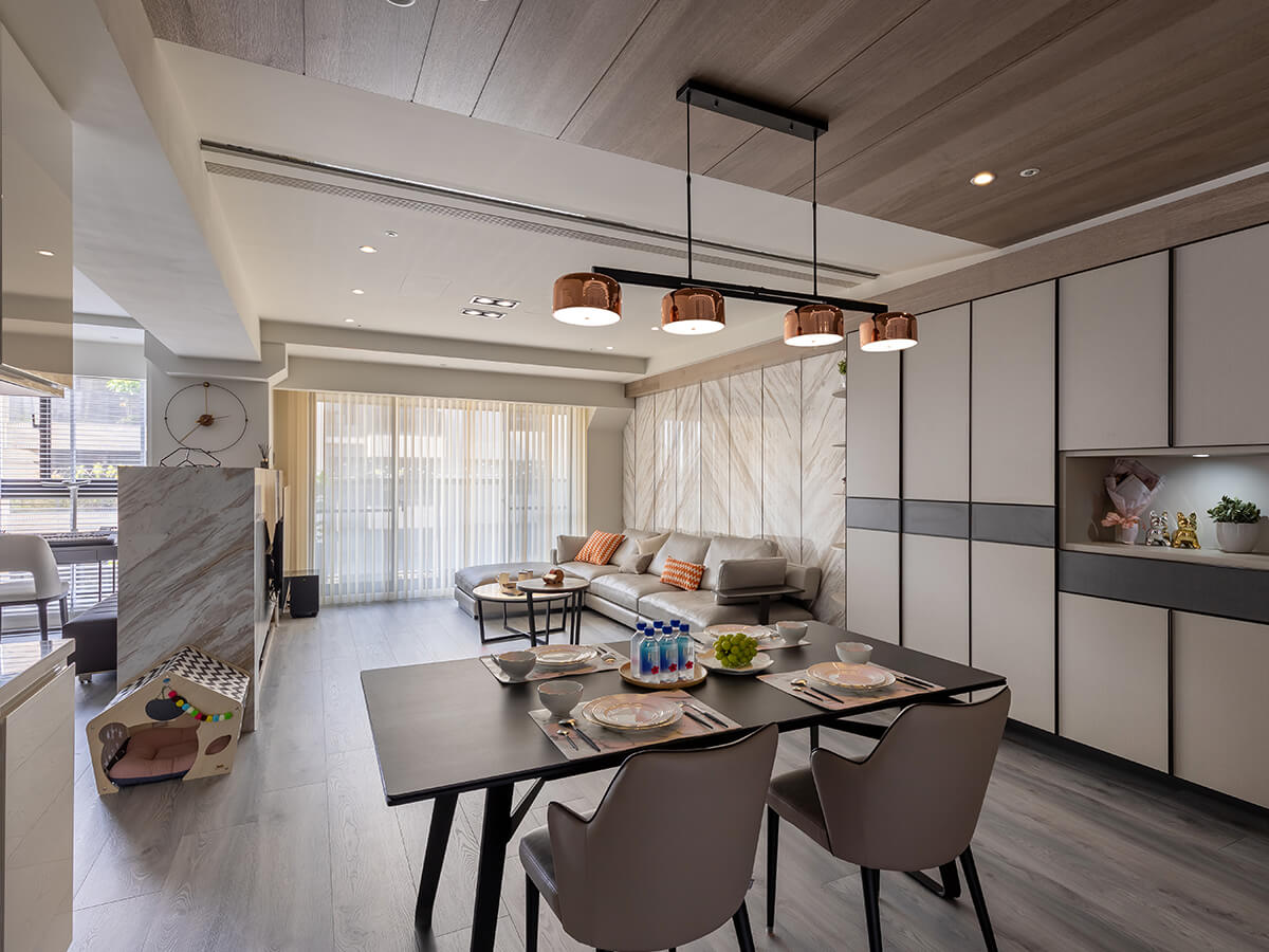 開放空間往餐廳區延伸,「理想家」設計師陳憲志採用人造石材的平台式中島櫃,區隔餐桌和廚房,安置有插座,增大了利用空間,能擺放食材、菜餚甚至在這裡吃火鍋,容易清理,天花板懸掛下來的兩層式鐵件烤漆架,往上收納時髦又實用,右側專為大型冰箱等家電量身定做的白色烤漆系統櫃,質輕、光滑好清理,抬頭一看,特別設計的木質天花板加上投照燈,注入家的溫暖幸福氛圍。