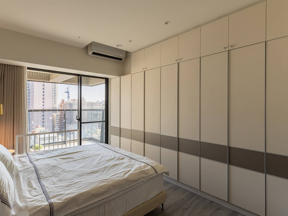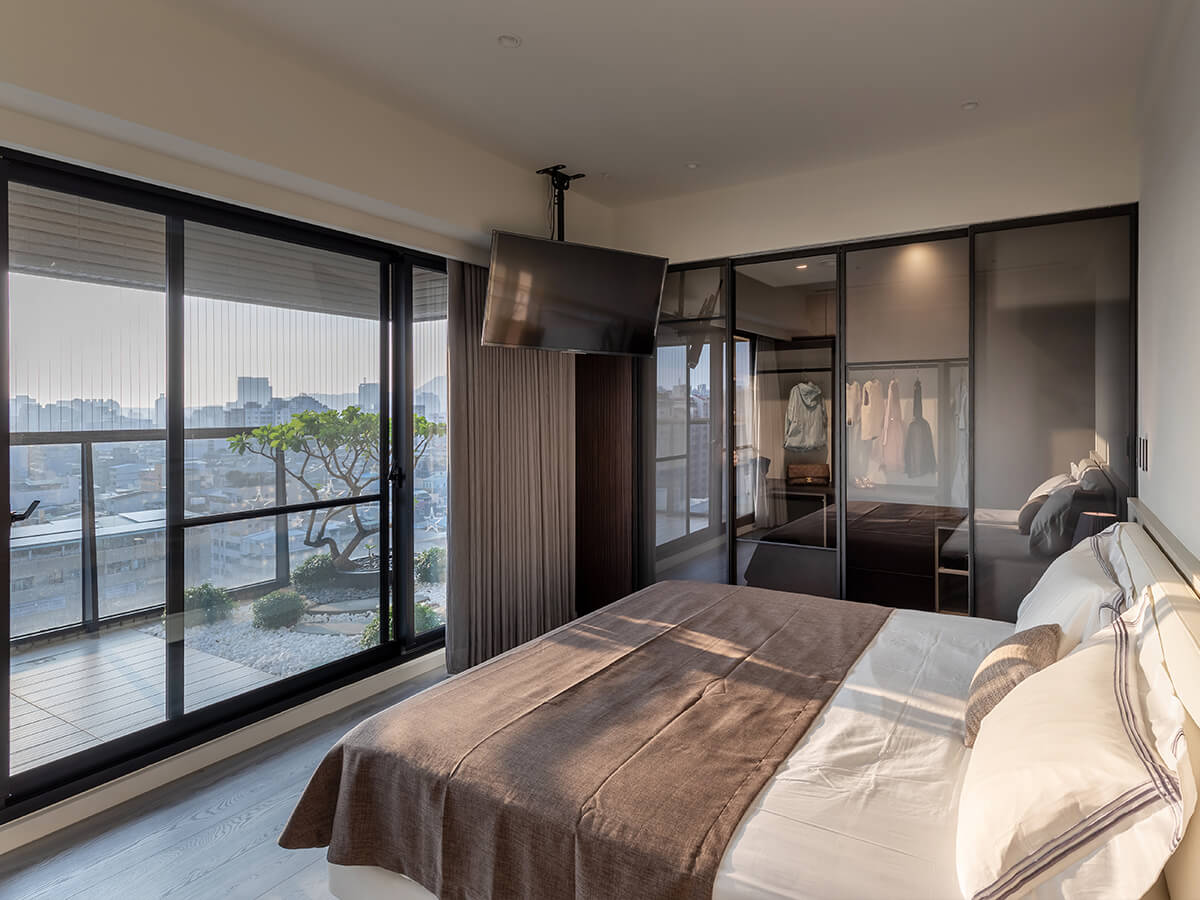 次主臥室兼當客房,梳妝桌、開放式收納櫃一應俱全,皮革與木質的金屬光澤彼此交融出異材質搭配的時尚感,望向禪風意境的造景小陽台,賓至如歸。