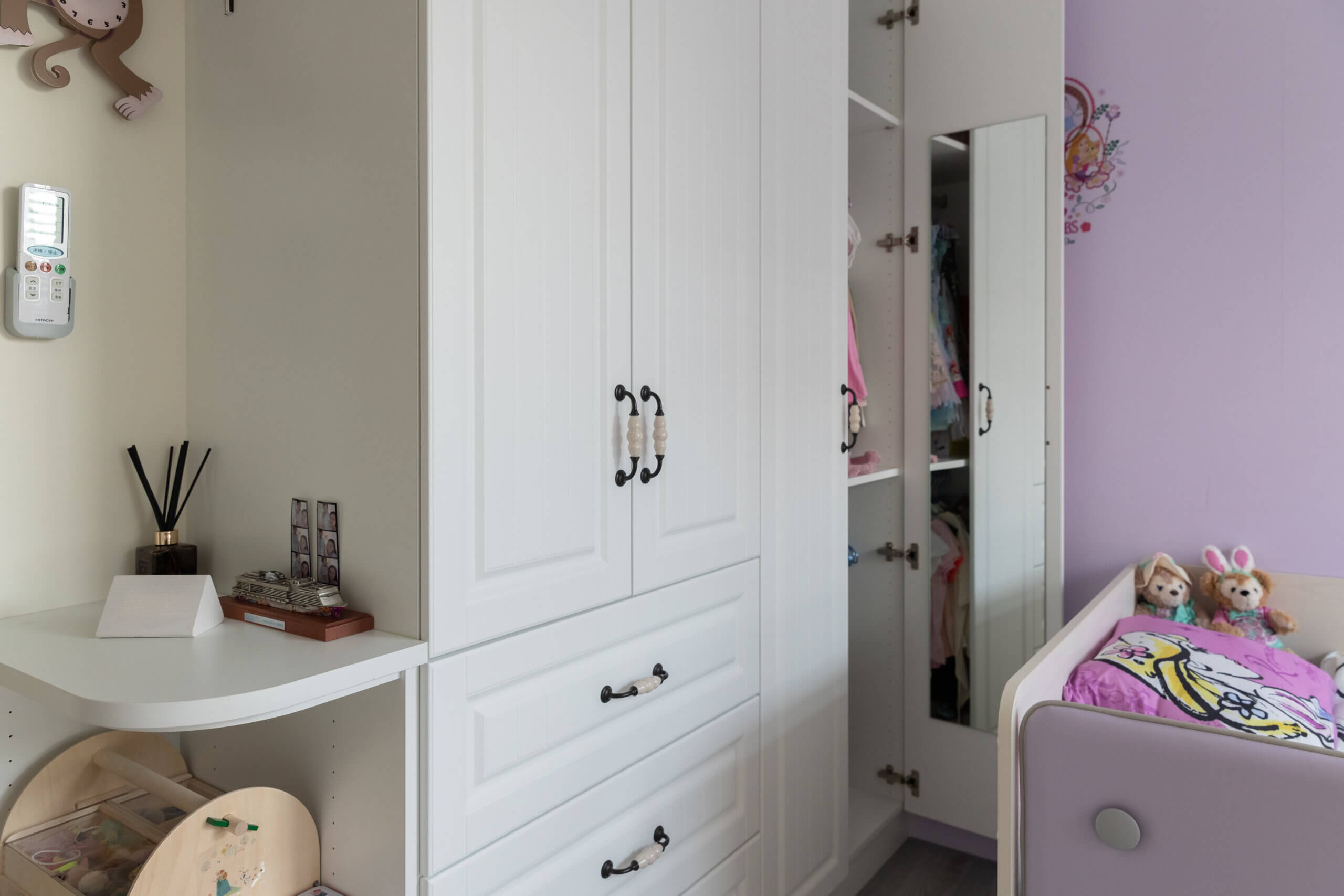 探訪小女兒的房間,發現儘管年紀幼小,卻很有主見,從入門就感受到迪士尼「公主風」的調性,淺紫色系是她偏好的色彩,牆面手工塗刷馬卡龍紫藝術塗料,浪漫夢幻,取材大自然原料的日本AICA塗料,具有吸附異味、調節空氣濕度的優點,守護健康成長,「原本不習慣獨自入睡的女兒,住進新家第一晚就安詳睡著了。」顏太太很欣慰,順著牆角轉進房間的全套鄉村古典風格白色櫃子,兼有開放陳列、關門隱蔽的功能配置,可隨心所欲使用,打開衣櫃,長方形穿衣鏡現身,這是女兒的最愛,一語道盡追求美麗的喜悅。