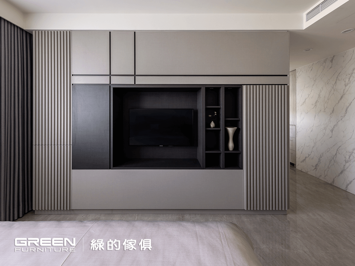 層架也以日本羽毛木搭建,雙邊系統櫃的背面是電視牆的空間。電視櫃崁著許多門片作為修飾,深色的布織黑搭配亞麻灰,讓色澤更顯飽和。