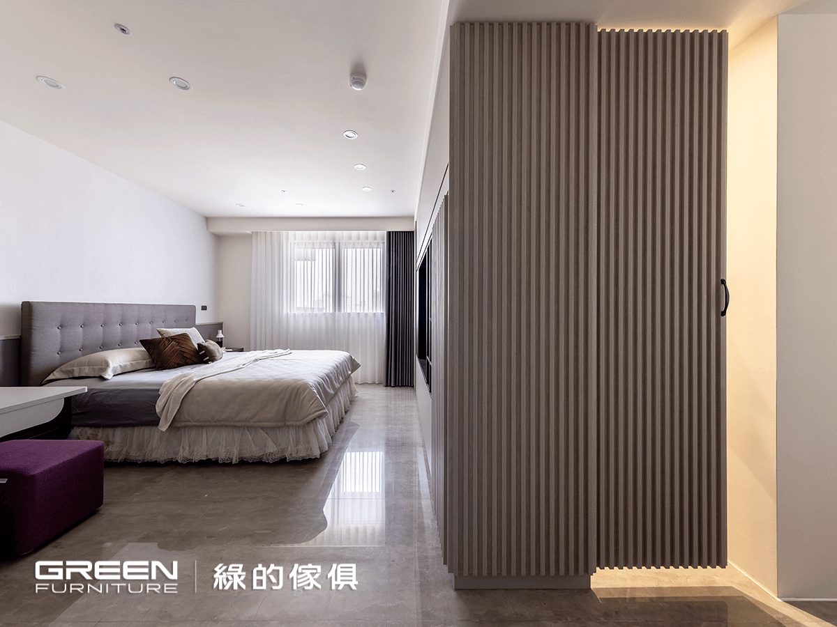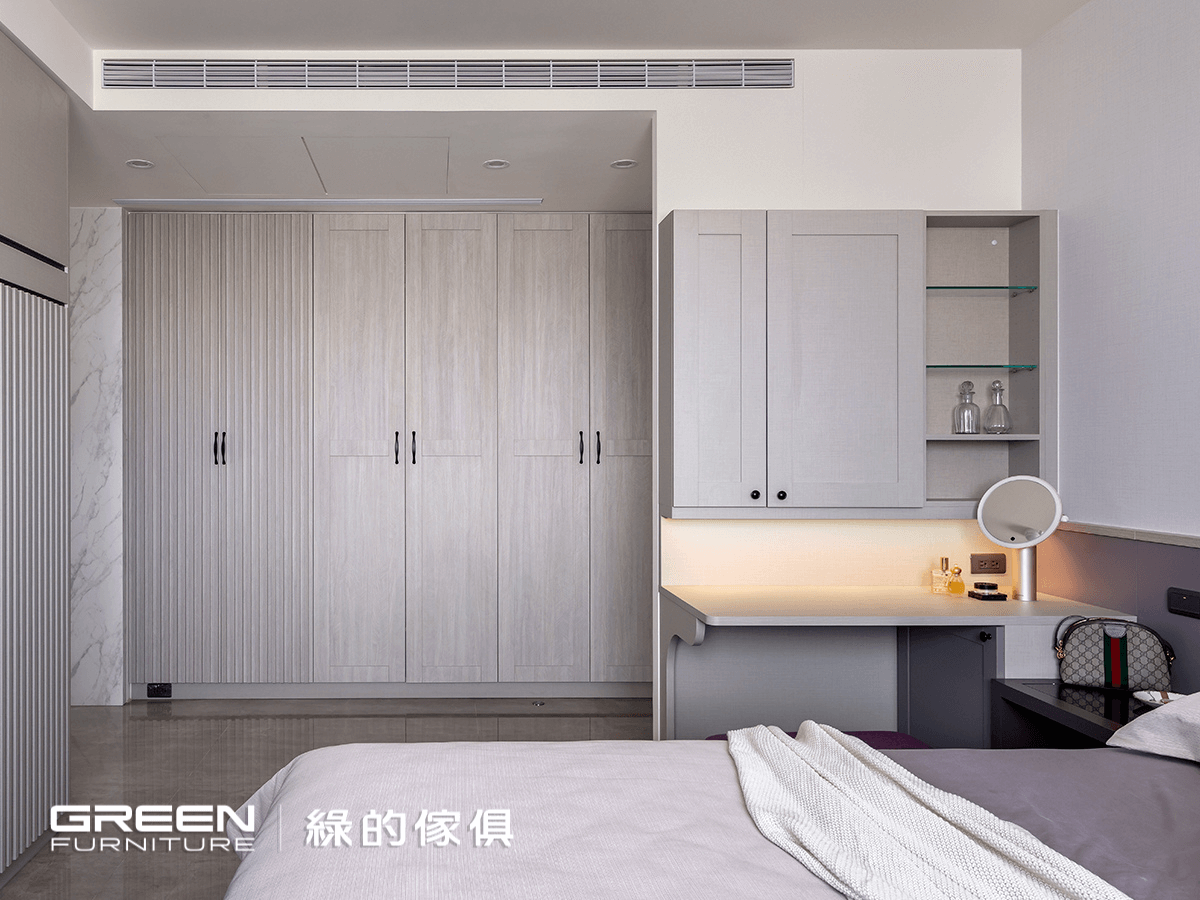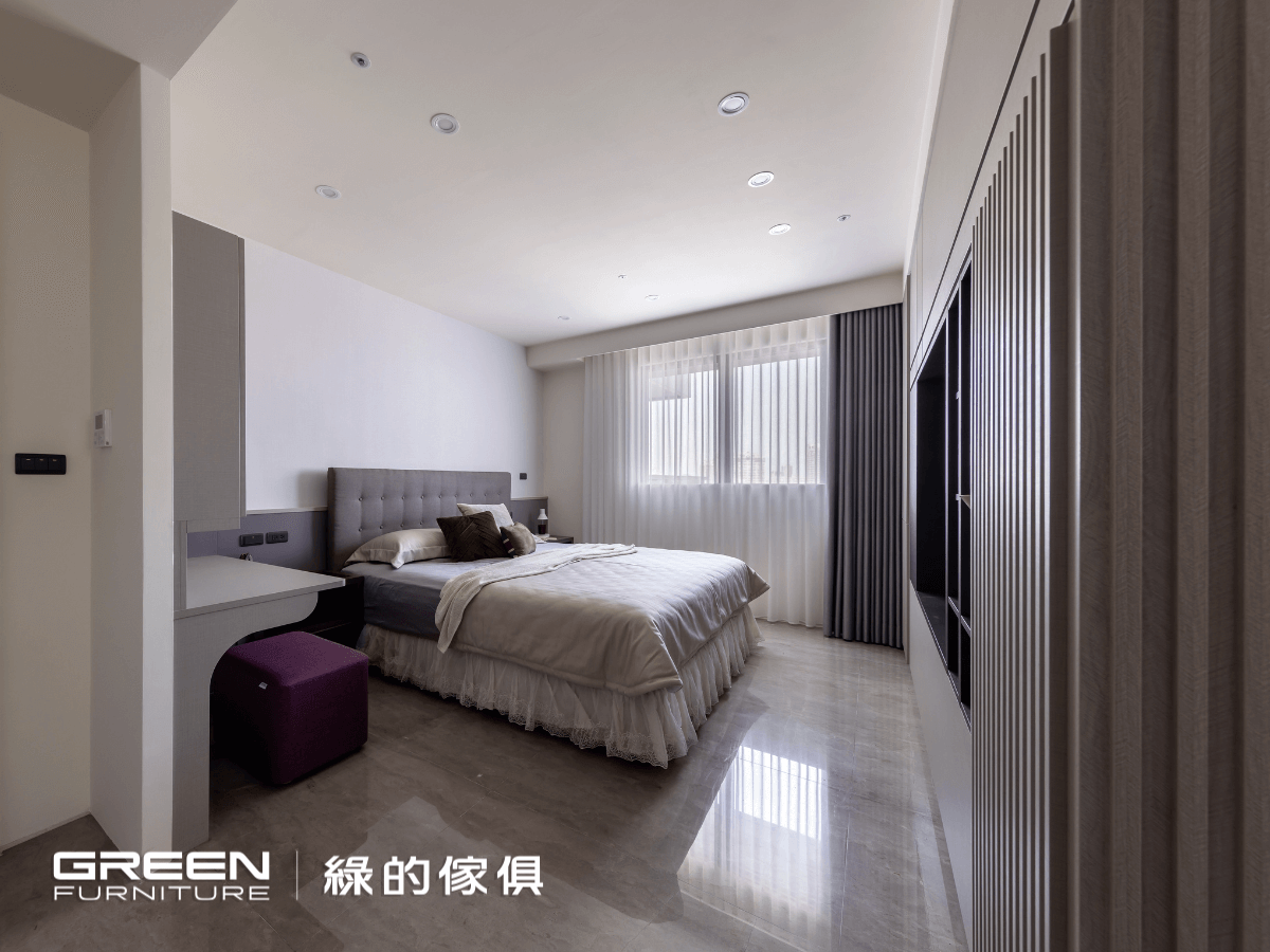 妝台以亞麻灰搭配大小門,內置妝鏡,妝台下設置了柔和的崁燈;床頭則搭配紫色烤漆,隱隱透露著低調的浪漫。