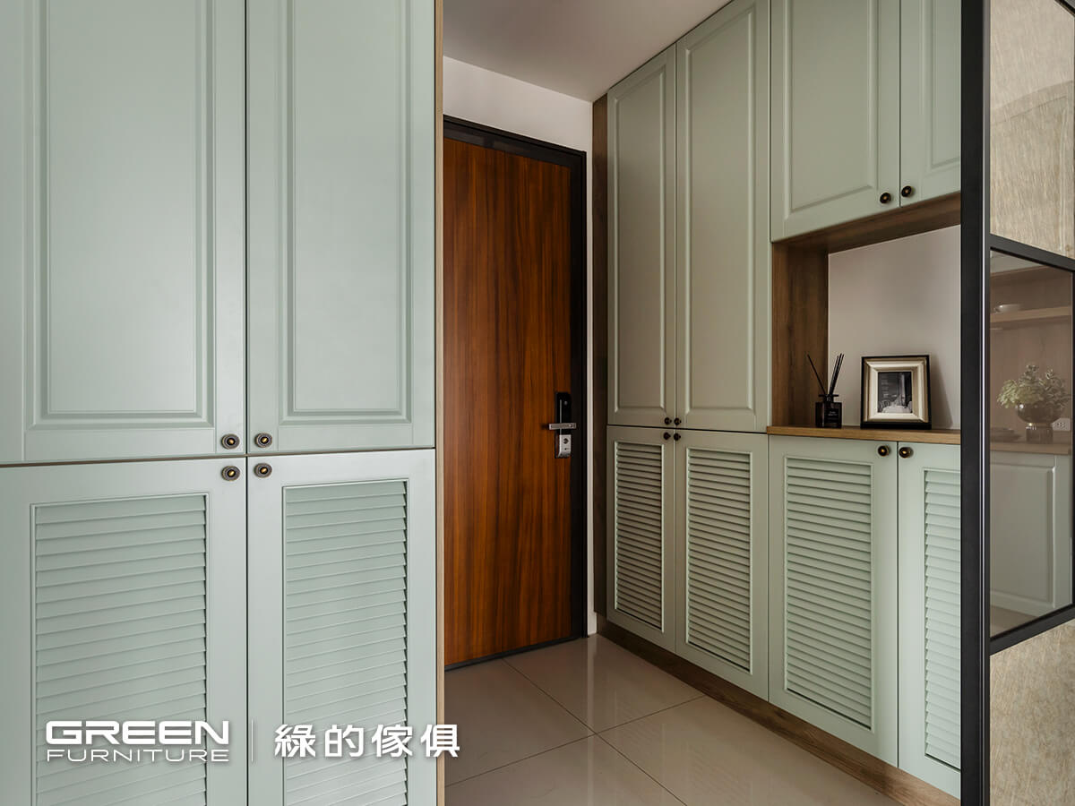 罕見的曙光青烤漆美式鄉村系統門片與金色把手,在開啟大門的那一霎那就被驚艷了。鄉村風線板及百葉造型的玄關櫃與鞋櫃,在核橡系統板材的襯托下,帶給感官無限的舒適感。為滿足多人口家庭的收納需求,特別規劃拉盤式鞋櫃,提供大容量且高效的收納空間,讓鞋履整理更有條理。