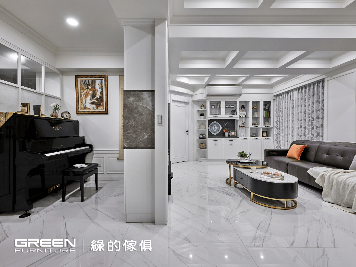 敞開格子玻璃門,如歐美雜誌般的唯美情景旋即映現,以琴房揭開家的優雅序幕,分別挹注柔白與雲霧石紋理,築起一方蒐藏時光記憶的櫥櫃,時刻回味昔日的美好點滴,循序而入,典雅純淨的畫面,源自女主人企望將客廳當作中繼點,藉此平衡二側私領域的迥然調性。