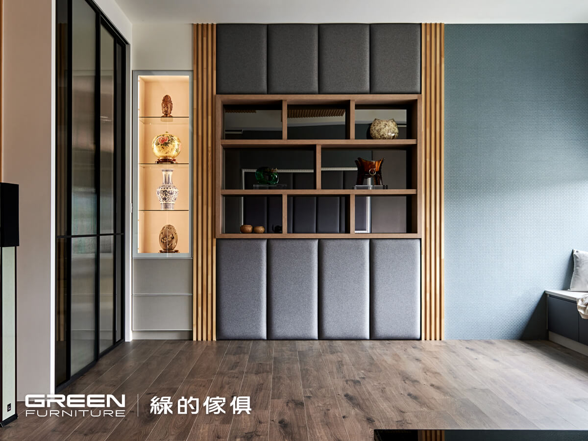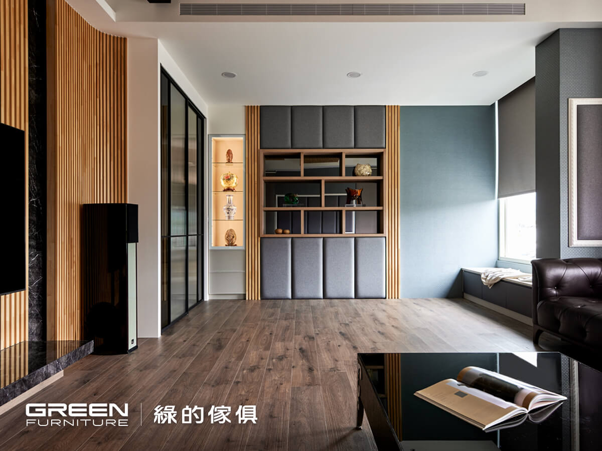 基於格局與動線的流暢度,設計師將原有的客廳改作視聽娛樂室,同時承接公領域的線性語彙,以特有的實木格柵鋪陳天花板與立面,襯上墨黑石紋透顯精緻典雅卻不失溫潤自然的氣息,依序輔以具有垂直條紋的長虹玻璃,隱現之間,釋出開闊視野亦可援引光線與視線,設計師細心說道,牆面同時結合吸音海綿,藉此加強整體的回音效果,以不妥協的專業精神,使夫妻倆擁有齊全完善的視聽娛樂體驗,亦可在無形間加深祖孫三代的情感。