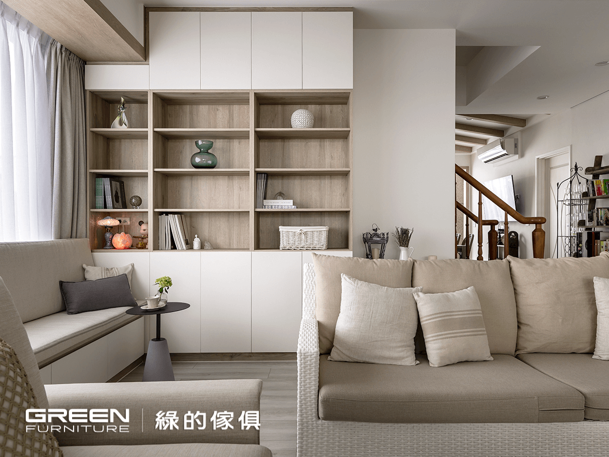 漫步入室,一道敞闊玻璃門窗,模糊了內外界線、消弭了窒礙動線,也將室外的蒼翠寧靜緩緩導引,簡約清爽卻不失溫暖的客廳,正是源於女主人傾心的南法風情,設計師表示,全室以溫暖木質奠定自然基調,揉合純粹的白與溫暖奶茶色,實現心所屬的裝潢風格。
