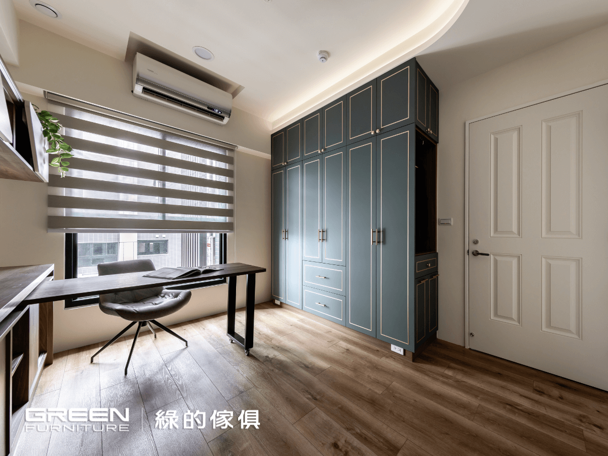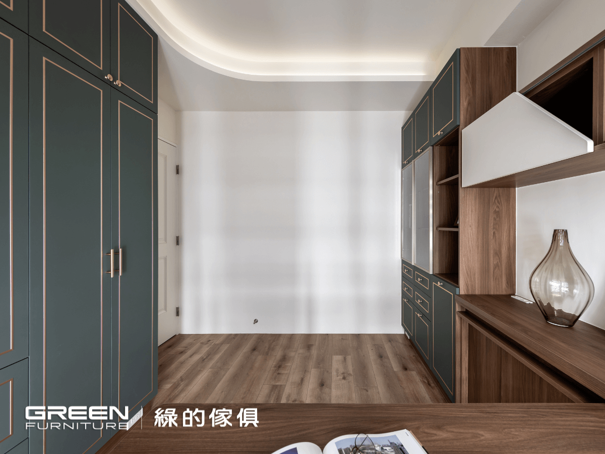 書房以王太太喜愛的綠色為主軸,設計師選用「香頌門-橄欖綠」系統門片帶有霧金飾條及五金,和相鄰的「波爾櫻」系統櫃巧妙點綴,提升溫度與和諧,賦予了間藝術之美與雅緻。