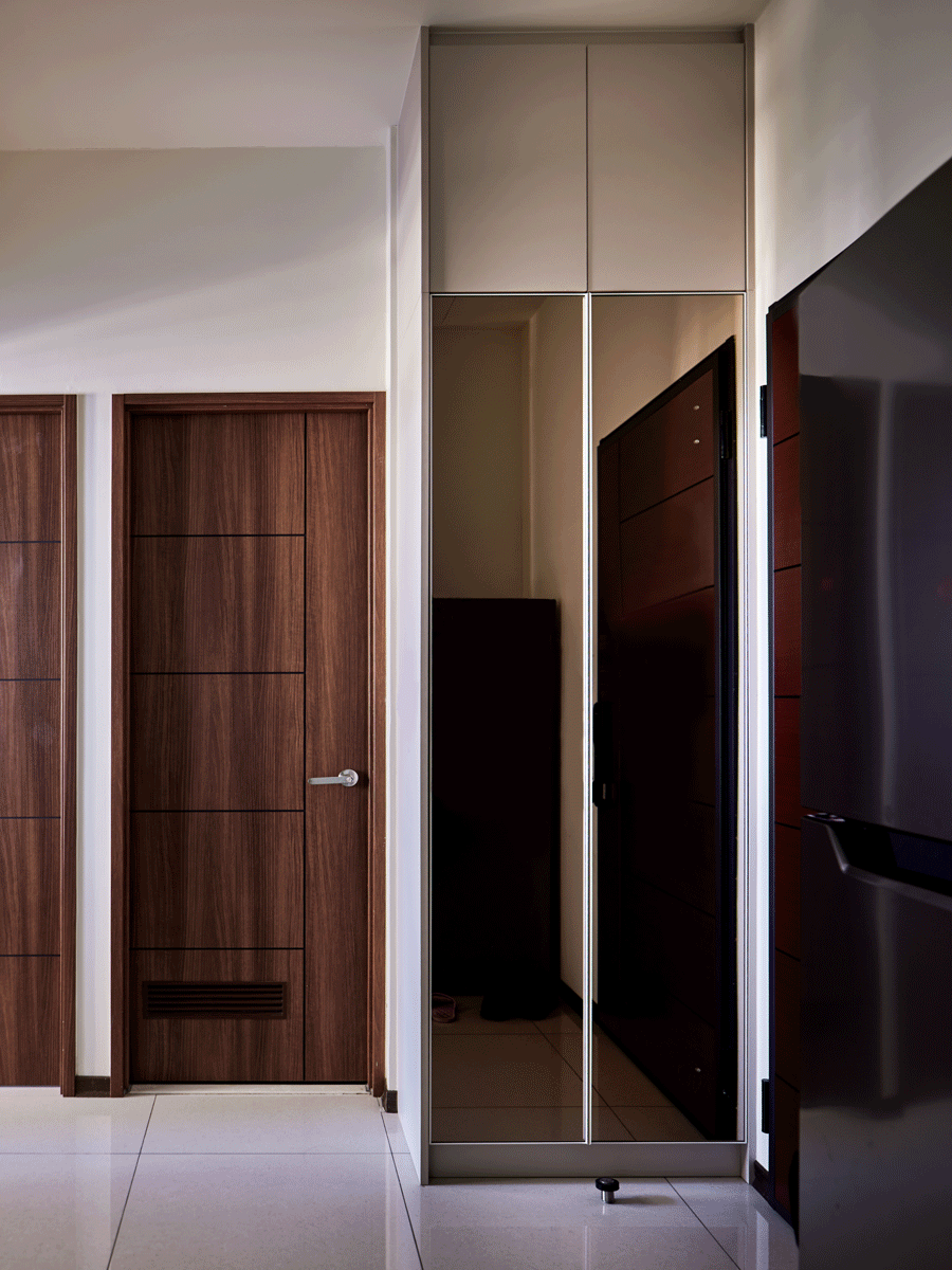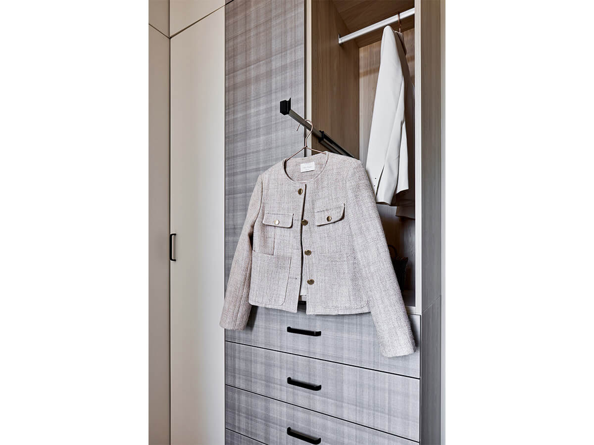 設計師將入門側邊電箱的畸零空間包覆設計成多功能櫥櫃,可置放雨具、球具等,還配備插座可供家電使用。關上櫃門就是落地的穿衣鏡,上層櫃體無把手按壓式櫃門可方便開啟。雖是挑高房間設計,設計師卻善用巧思創造空間的小驚喜,絲毫沒有忽略任何角落。