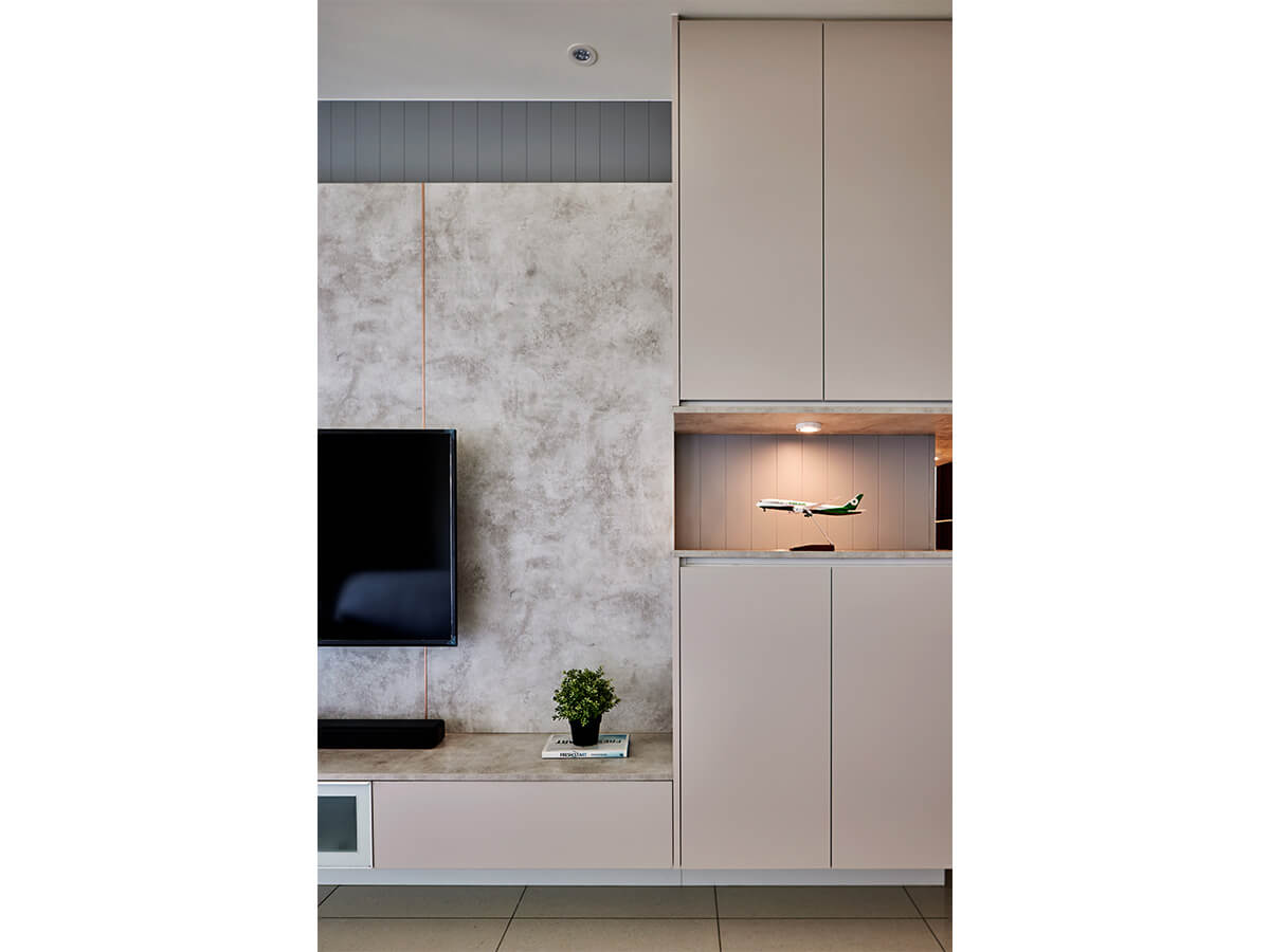 由於室內空間不大,屋主期待裝修能夠放大收納空間,而挑高房間設計最怕被滿室的櫥櫃困住。因此設計師運用異材質與線條的層次,完美調和各空間的比例與色調,打造屋主理想中的溫暖居家。