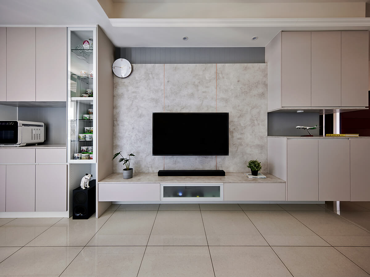 懸吊電視的壁面也運用角料做了多重的結構性加強,電視櫃的中央則是隱藏式收納設計,用來收納各種線材,乾淨俐落。
