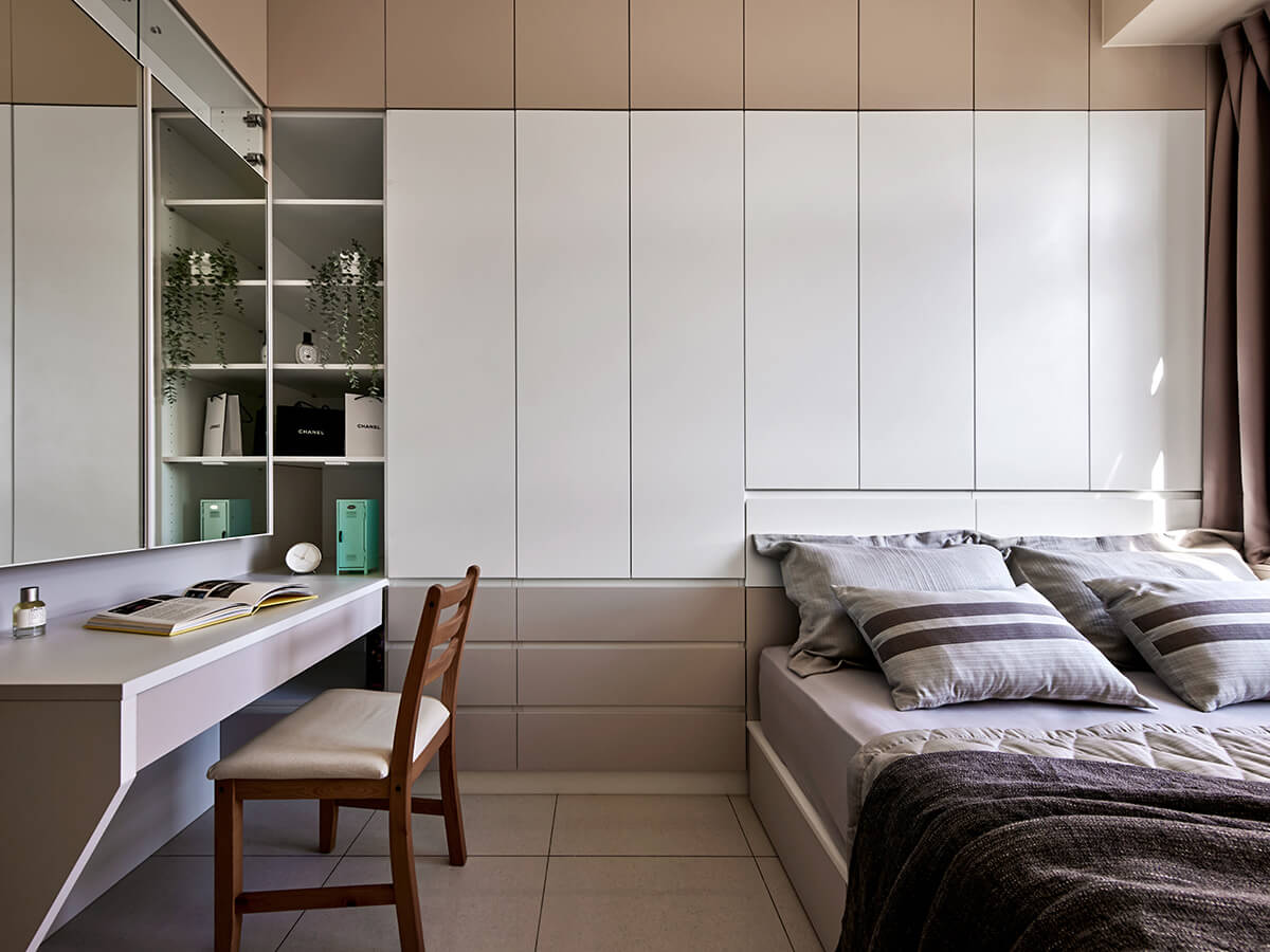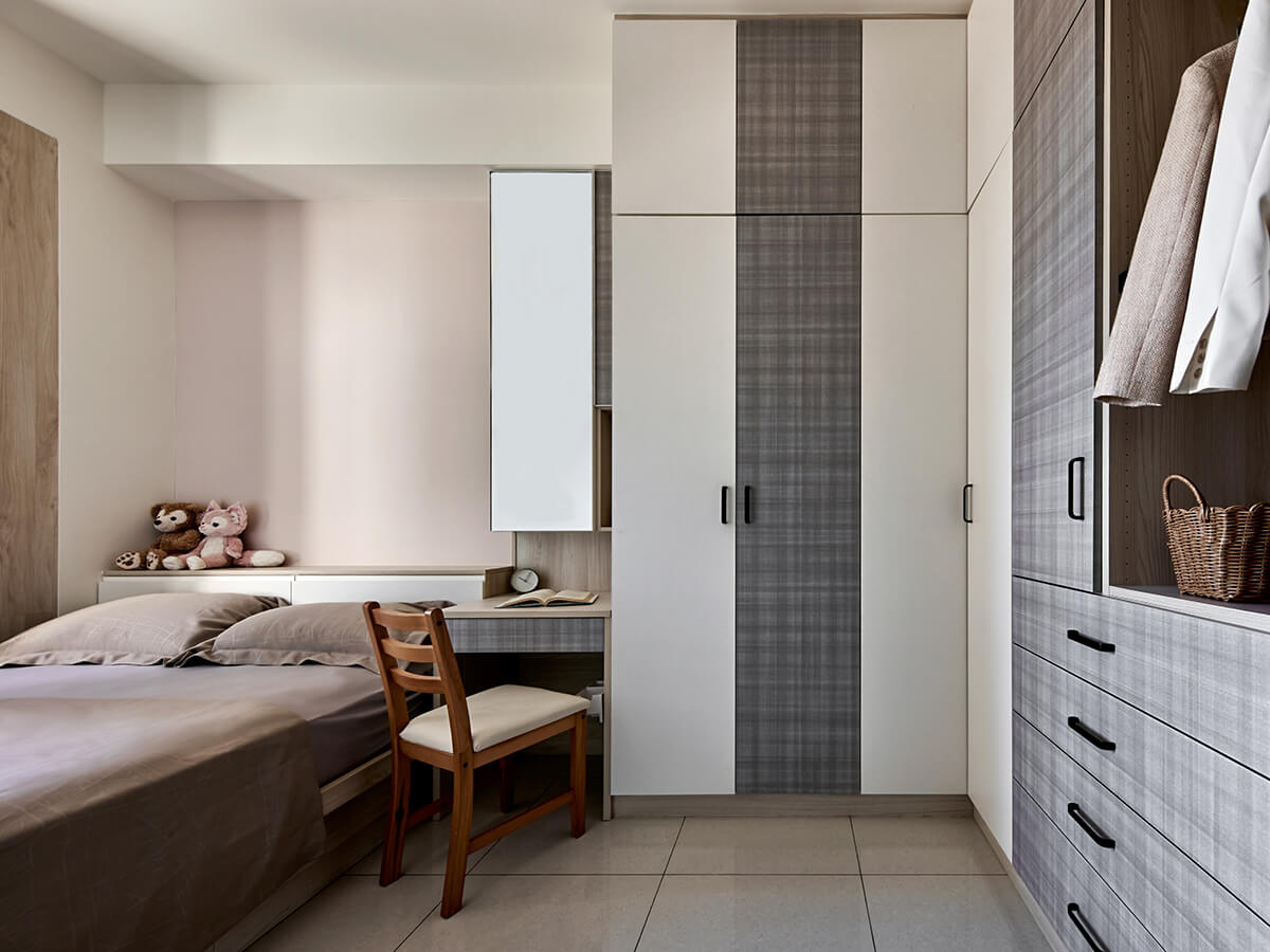 主櫥櫃以米黃格紋,搭配鑼帛突顯層次;櫃體以白詮輔以精緻的黑烤漆金屬把手,在細節裝飾上輕輕點綴,沒有過多的鋪張,隱隱透露著內斂低調的簡約感,又帶著滿滿的英倫風。主櫃面板以白、灰跳色處理,活潑又不失莊重。L型的轉角型衣櫃,搭配特殊鉸鍊,櫃內偌大的容納空間也讓人喜出望外。緊靠樑柱的床頭櫃以下掀的淺收納與樑柱貼齊,降低樑柱的存在感;臨窗走道旁側掀床架也為主臥帶來額外的收納空間。