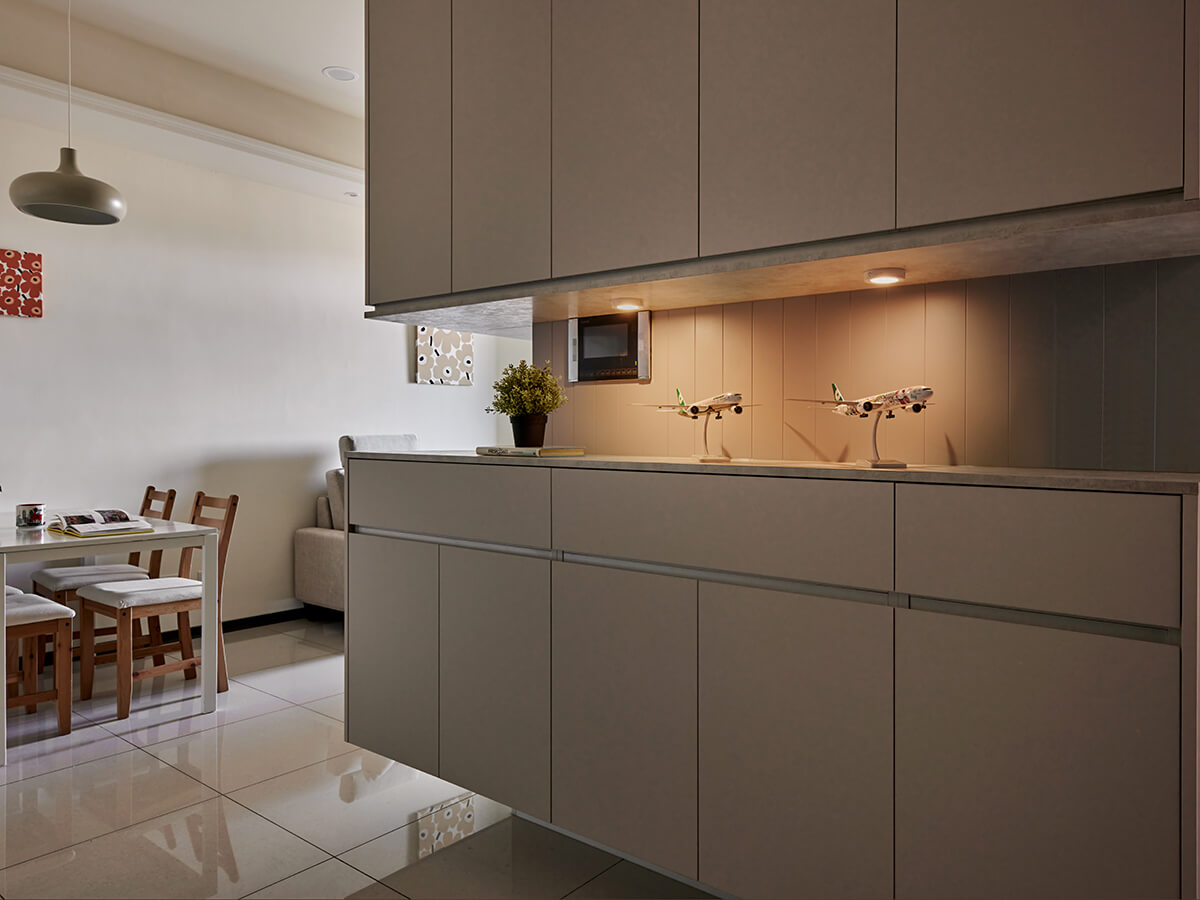 後端牆面延伸的側邊櫃平台則可置放小家電,補足廚房收納的不足;上層櫃體內部的層版則可自由調整高度。緊鄰的玻璃櫥櫃,白色烤漆搭配鋁框帶來高雅的金屬感,裡面收藏著女兒從世界各地收集來的城市紀念杯,歡快又熱鬧,自成一座世界櫥窗。