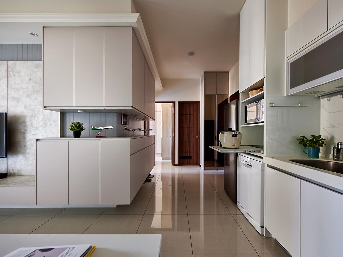 廚房電器櫃則搭配原廚房色系,白色面板以十三道鋼琴烤漆的嚴謹工法完成,色澤飽滿且優雅。托盤式滑櫃的設計也為廚房增加臨時檯面,方便各式小家電的取用。