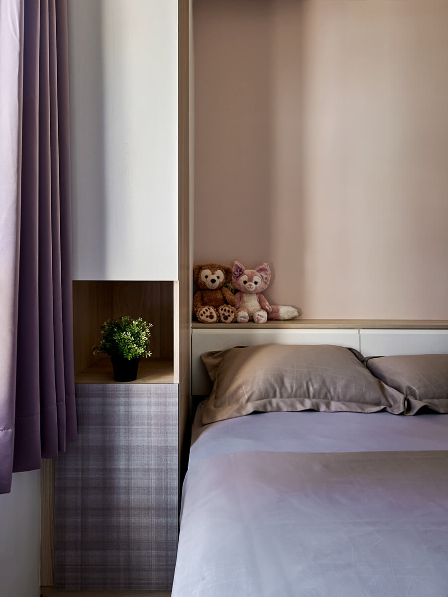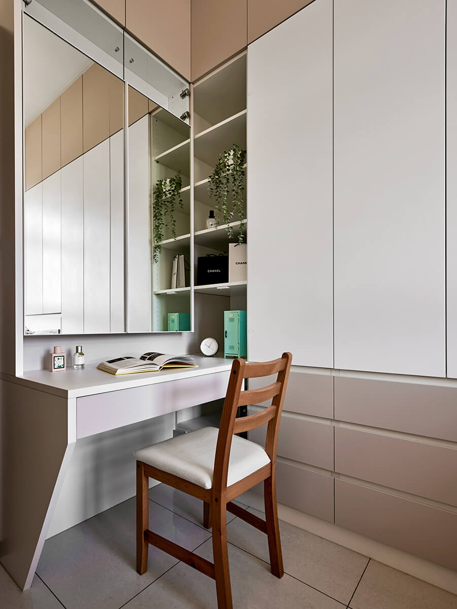 女兒房的色彩主調以白色系跟奶茶色的特殊板材交織而成。「綠的傢俱」特殊板材的色澤會因為光源與角度而有所變化。主櫃體以白色系為空間定調,白天在自然光源的照射下,呈現粉色系,明亮且清新;缺乏自然光源時,它就是浪漫的藕色系。室內完全的無把手設計,讓空間線條極致簡約。床頭的下掀櫃,掀起面板後自然形成一個檯面。床架下方則是無把手按壓式抽屜櫃,滿足了使用的便利性。緊鄰房門的桌邊則以斜面切割定位,既有安全考量,也讓空間增添層次。
