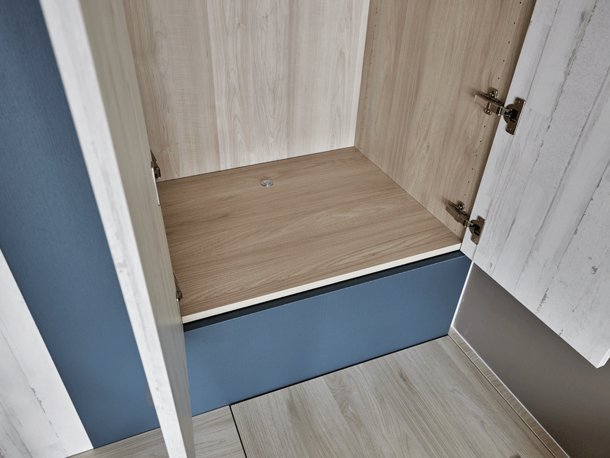 入門玄關處,左手邊是一大片直立的穿衣鏡,相當實用。右手邊採取包框美化手法,在邊樑下打造深、淺木紋呼應的收納櫃區,不僅上、下櫃跳色活潑,下方櫃面還能當作置物與展示空間,矮櫃則可供主客坐下穿脫鞋子,消除疲勞。緊接著4扇門片的直立櫃體往客廳延伸,同樣是雙色交響,裡頭擺放直立式吸塵器等等大型家用品很理想。