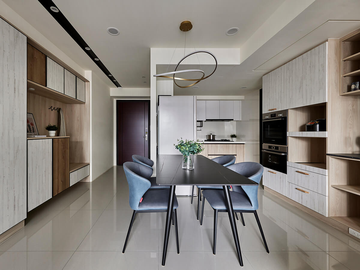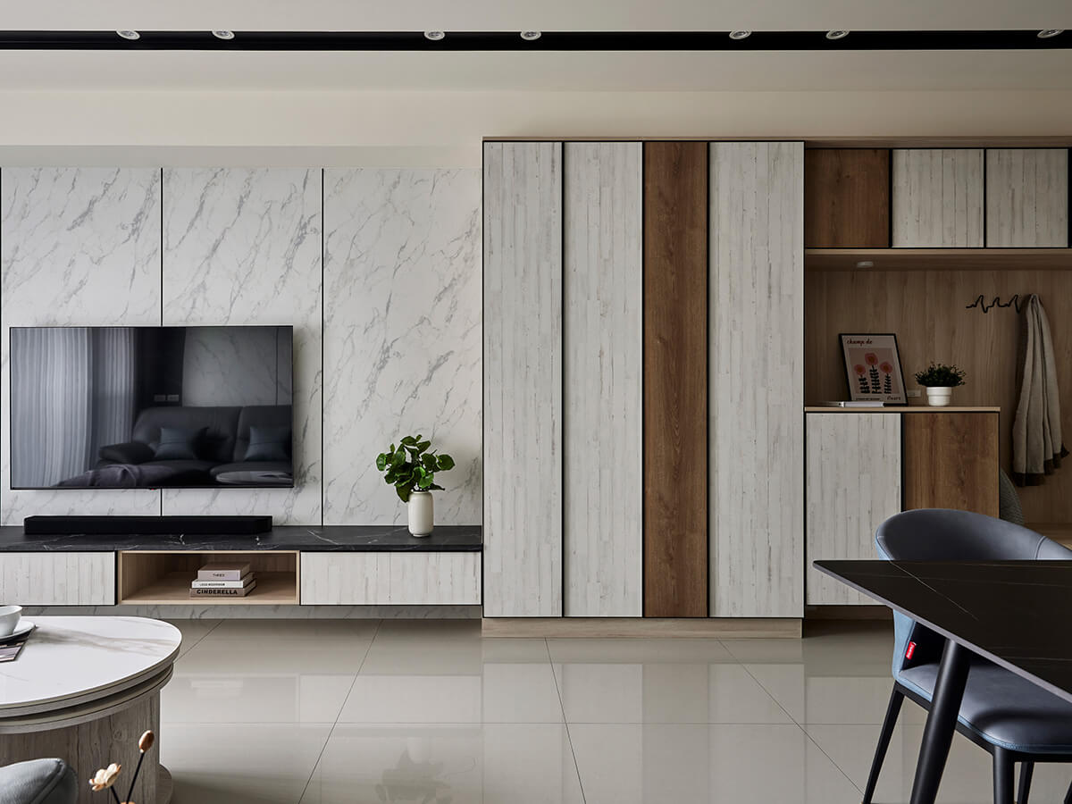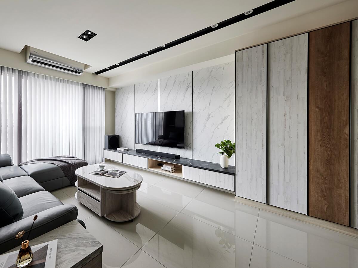 客廳空間呈現和諧的協調感,仔細探究,原來設計師為沙發後方背牆使用仿石紋系統板材打造,與對面電視牆形成對稱,黑色的金屬飾條在兩面牆板上散發漸進式的美感,滿足了男主人喜歡在開放空間裡以黑白色調搭配擬真的木紋紋理與觸感、將現代簡約風格融入北歐風新居夢想。