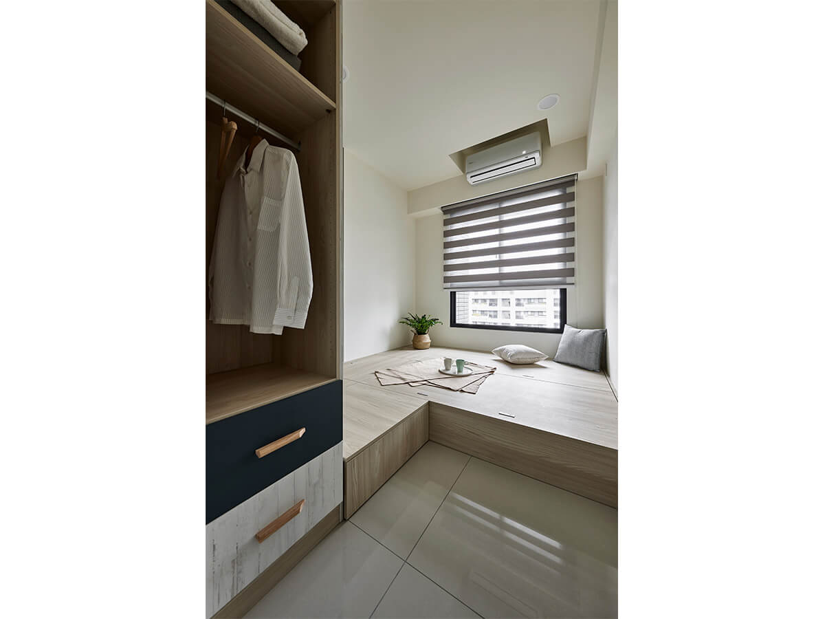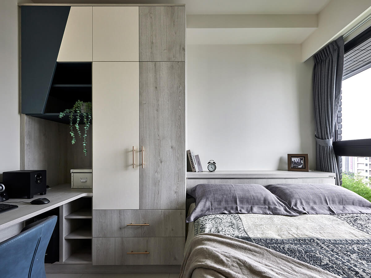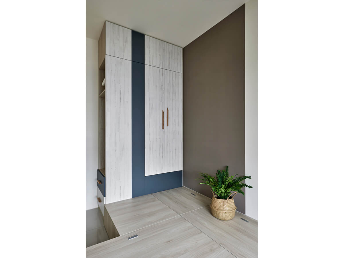 小孩房以灰橡為空間配色,佐以油漆作整面牆的色度呼應更和煦;客房和室選取白詮、波布藍色調搭襯地板的松木色,調性晴朗;主臥房使用褐、灰配色,搭配臥床牆面灰藍色油漆的動感,在穩重氛圍下還飄揚低調的奢華風。