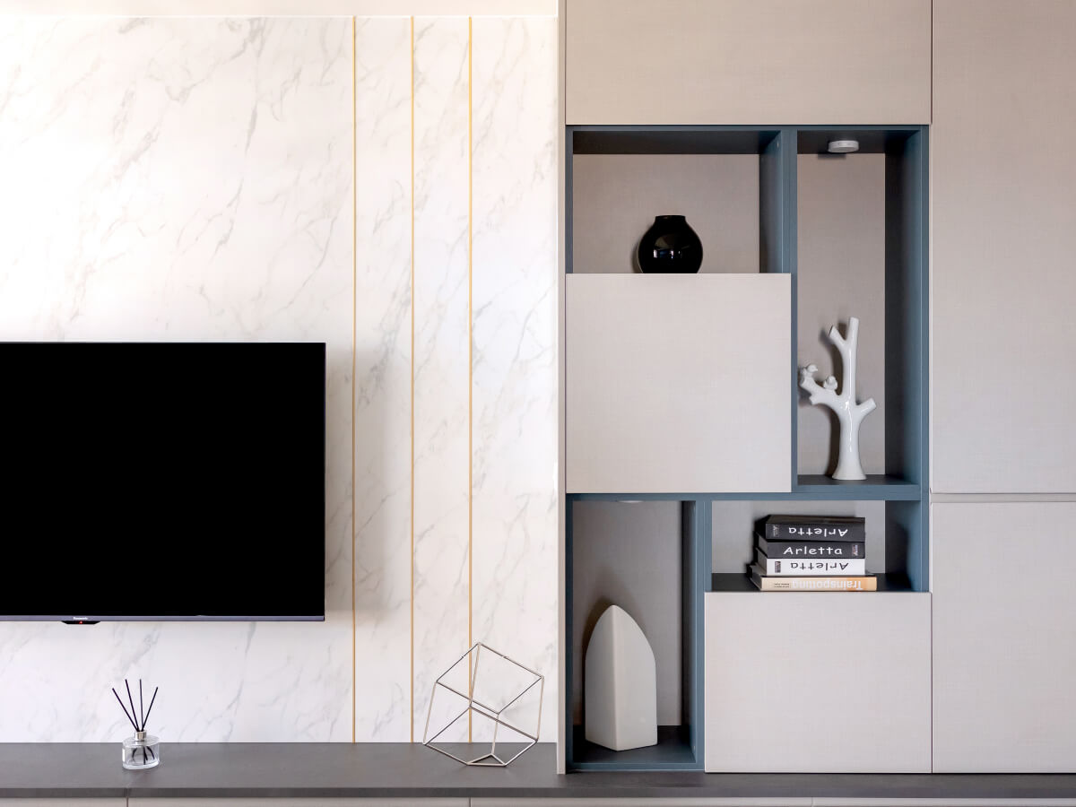 往電視牆踱步,咦!牆面可是迷宮?原來是淺灰褐色的織布紋書物系統櫃,有門的、不設門片的交織而乍看流露出迷宮的趣味,男女主人都喜歡;大理石紋板材電視牆面的金條框線有加固效用,卻不等距,這就憑添了年輕化的活潑律動。