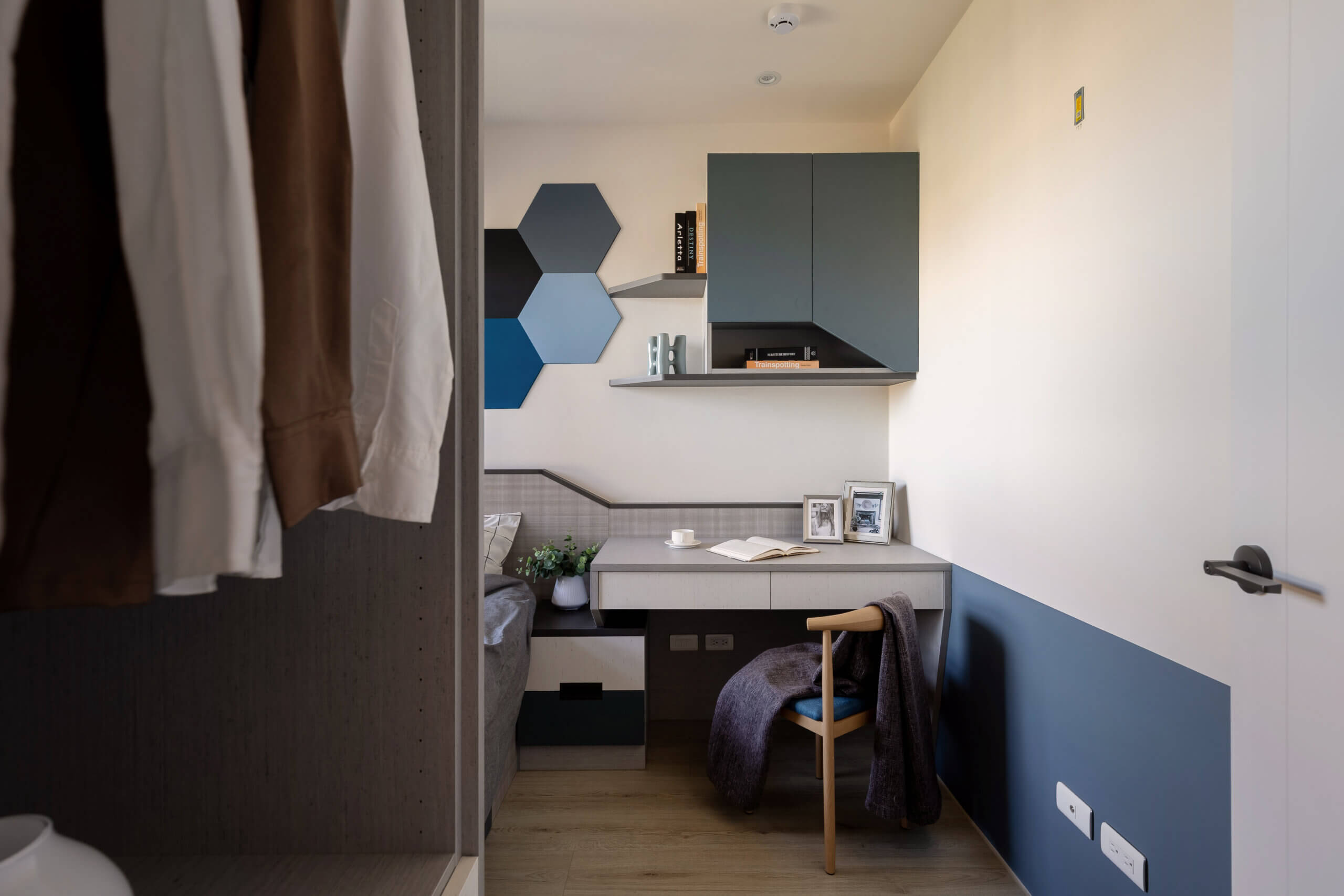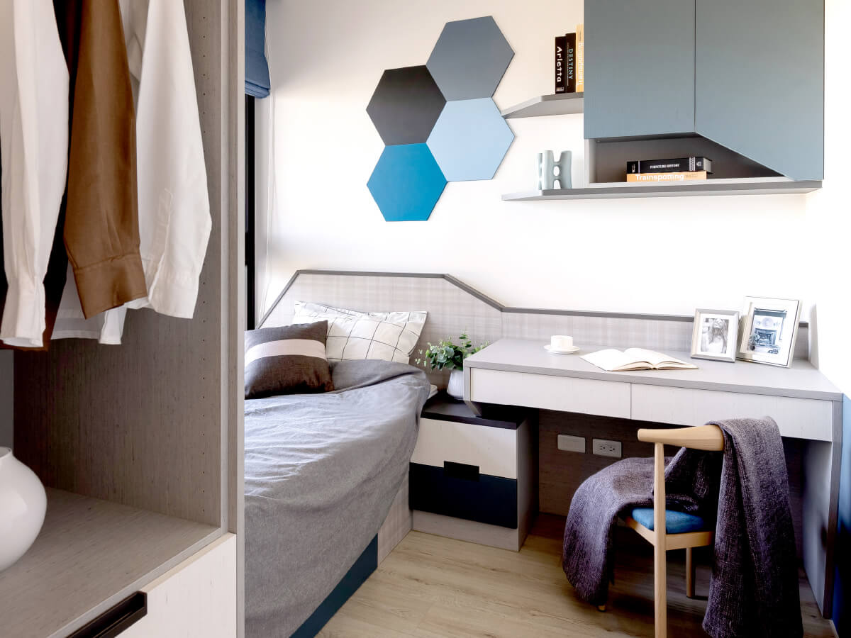 女主人一再嘉許的次臥室,到底在設計上有何魅力?她示範說,往床下輕輕踢腳,收納空間就緩緩彈出,「這房子,真的滿足了我們的想像力。」十字布紋床背板為基底,灰、藍、白色的收納櫃、牆上六角形色塊的蜂巢圖案,彼此水乳交融,有線條變化感的牆背板與牆上置物櫃如同抖動的音符,不規則的美收服人心,近門的系統收納櫃則是藍、白、褐大地色自然對話,似乎能把人的思緒帶到愛琴海畔。
