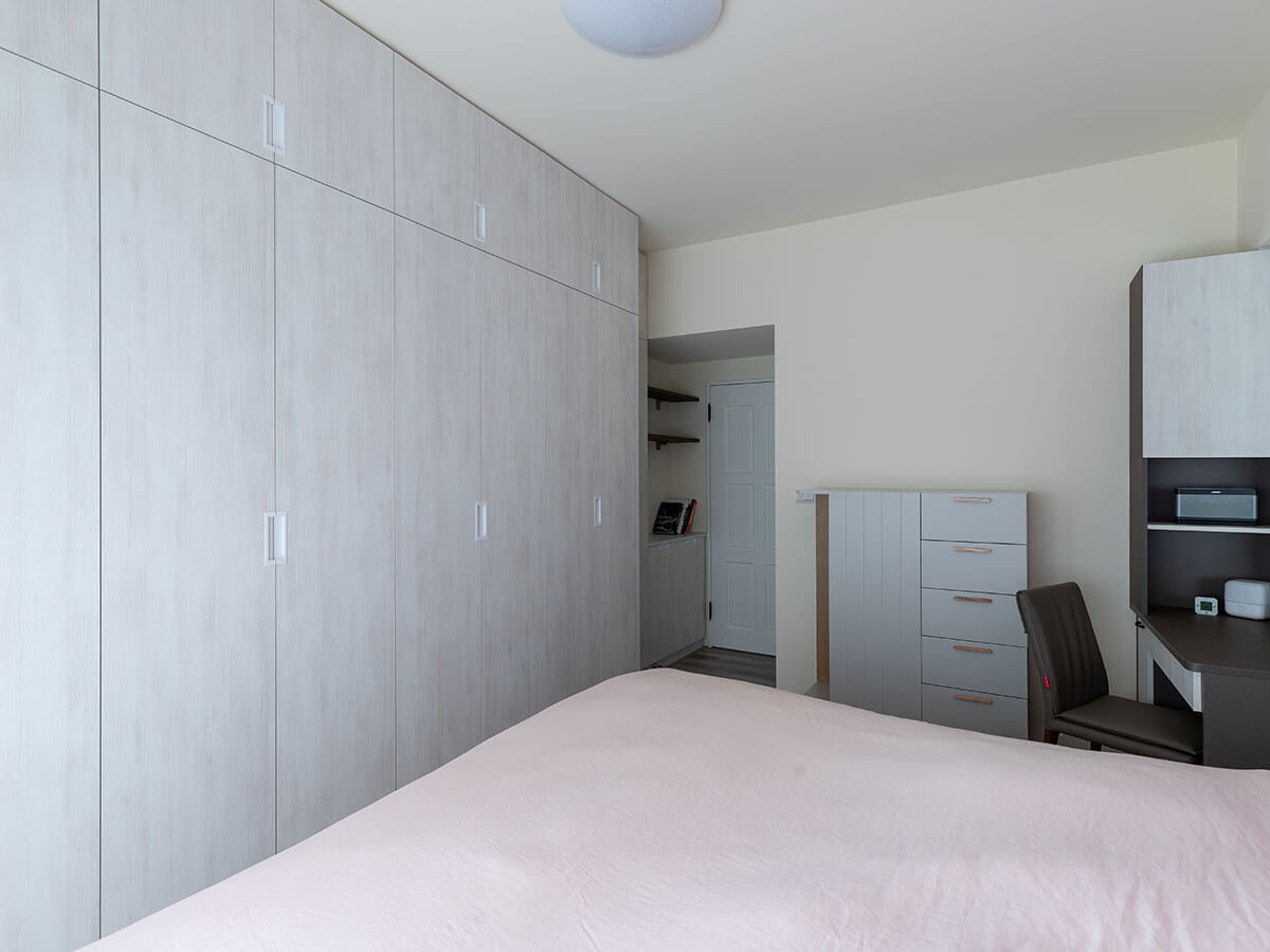 進門後右手邊就是全牆寬的沁白衣櫃,上頂天花板,供應女主人收納整理的需求。大床背板上頭的長版小平台,可隨手放物,化妝桌、鏡、收納櫃位於大床右手邊,沁白、布織黑時尚合體,為能充分利用空間,美顏品櫃沿著牆面往外拉,就不會擋在化妝桌前了。另有一件白色單品櫃,右半是抽屜設計,左半從側邊開門,正可對著橫桿掛進孩子的衣服,符合機動收納的理念,未來等女兒長大、把遊戲間改作臥房後,還可移過去用來收納。