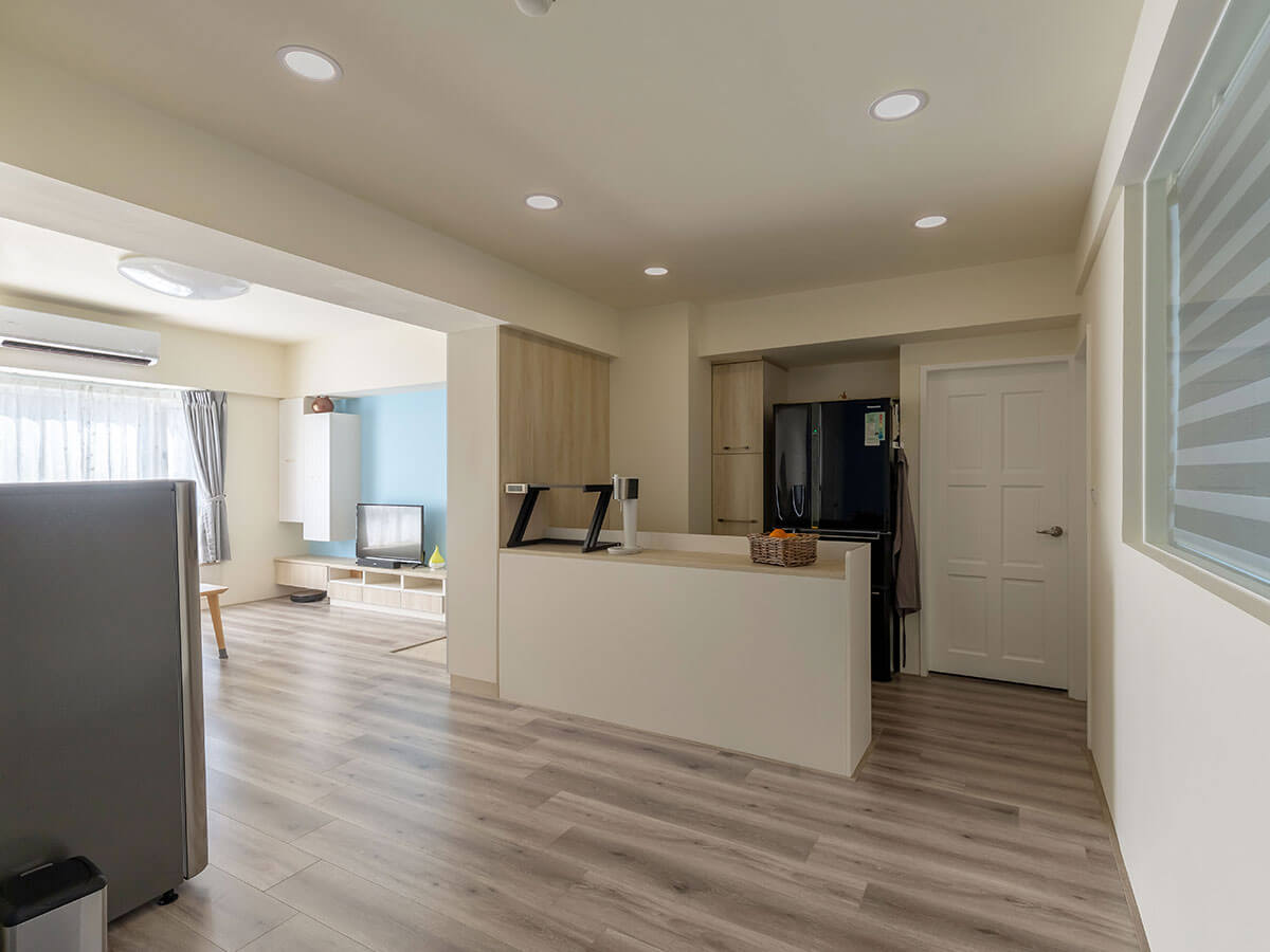 在客廳空間,吳錦英先是拆除了中古屋既有的壓低天花板,使得從窗外導入的陽光能夠大量地照暖更多空間,針對餐廳天花板再配合冷氣配置而調整,強化間接光源,女主人要求的明亮光線,使命必達。