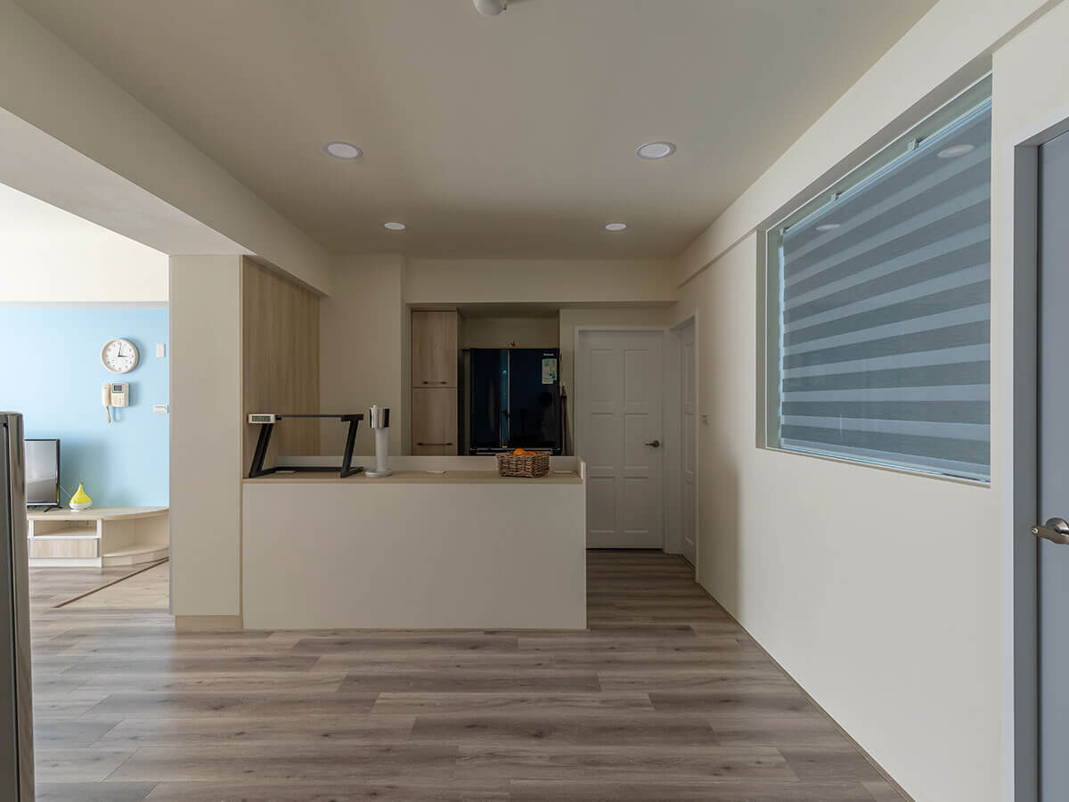 白色與木紋、鑼帛與白銓雙色的雙色基底,重複出現在空間的架構中,注入幸福質樸、在低彩度中適切留白的洗練靈魂。灰色工業風木門、布織黑書桌就是抖落其中的輕巧音符。