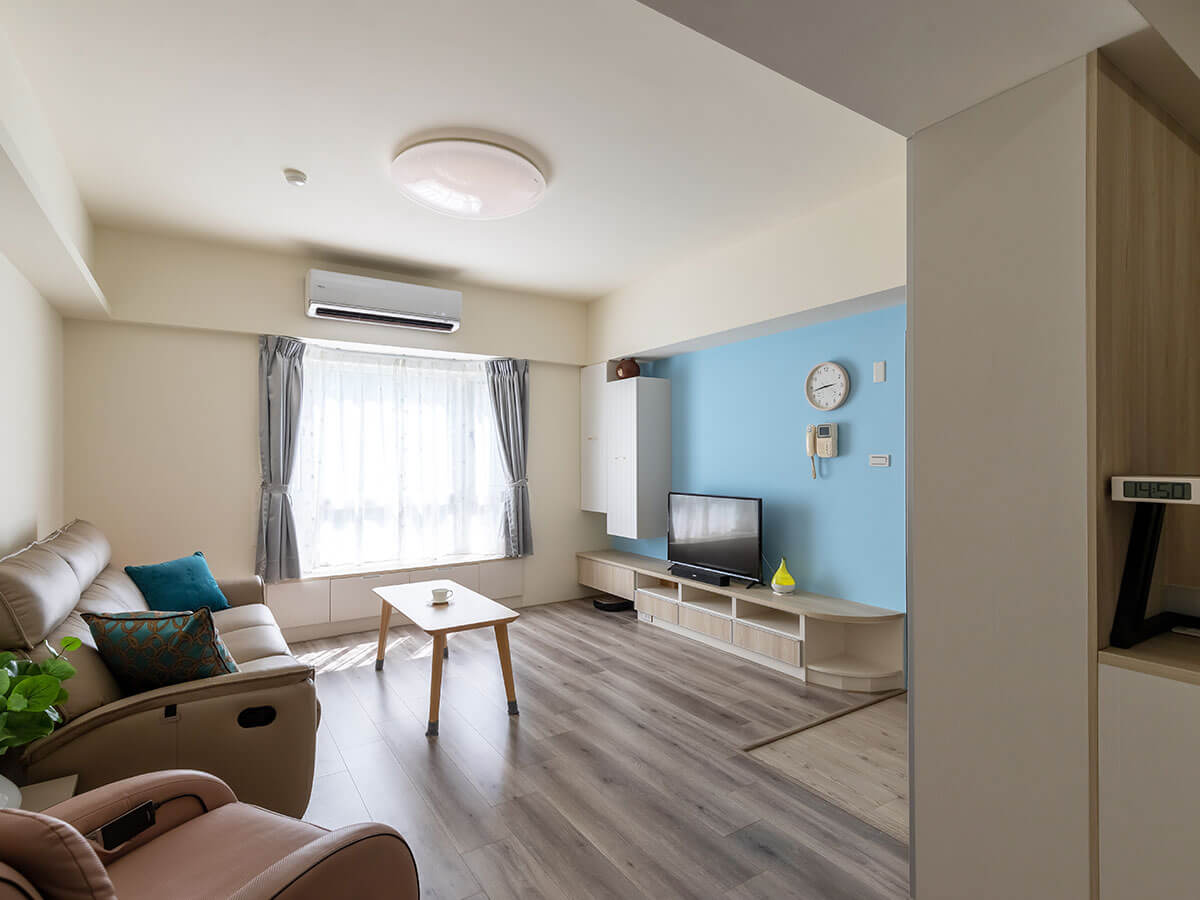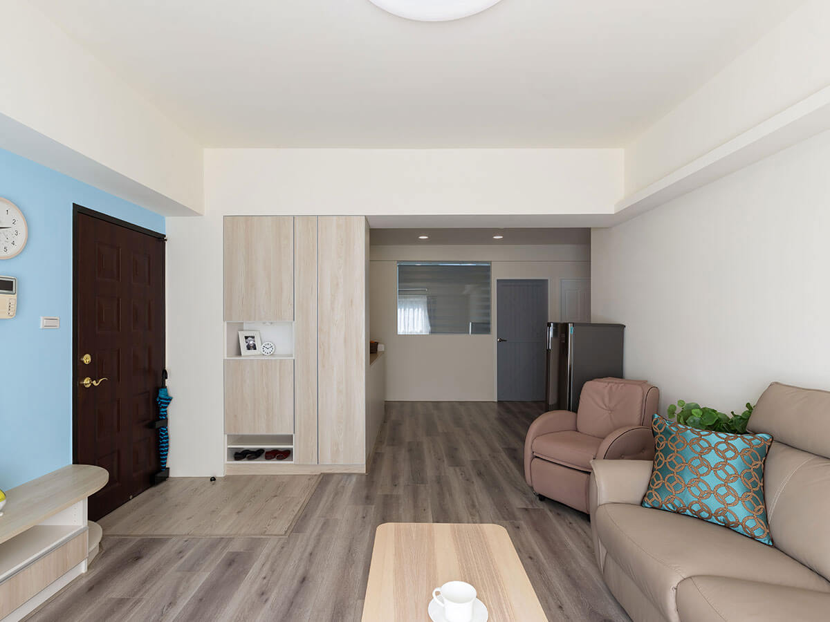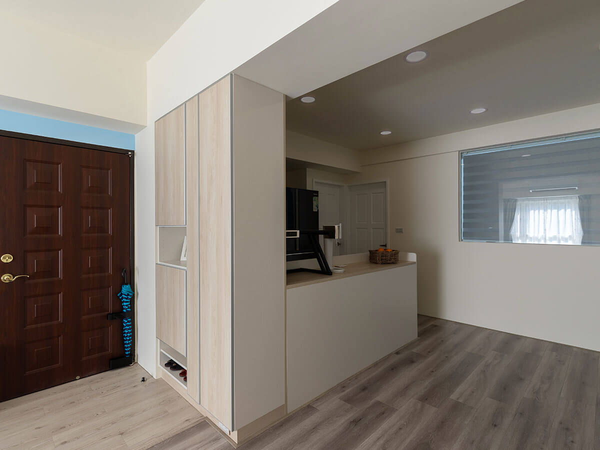 一進門的左邊,高抵天花板的系統鞋櫃置物櫃,如同一片牆,兼具玄關功能,櫃內安置燈光,取物能看清楚;櫃體中段的開放平台可供放置錀匙、手機,同時擺上時鐘或展示品,底下除了有門鞋櫃,也有開門櫃,讓剛脫下的鞋子透透氣,右半櫃則配置來吊掛衣服,各得其所,都加鋁框邊加固,呼應電視櫃的款式。客廳電視下方的橫櫃結合白色、木紋兩款板材互相映襯,儲物櫃的掀啟面以鋁條框收邊作變化,注入現代感,牆壁左上方兩個不對稱的鄉村風烤漆白色櫃,增添簡約中的舞動趣味。