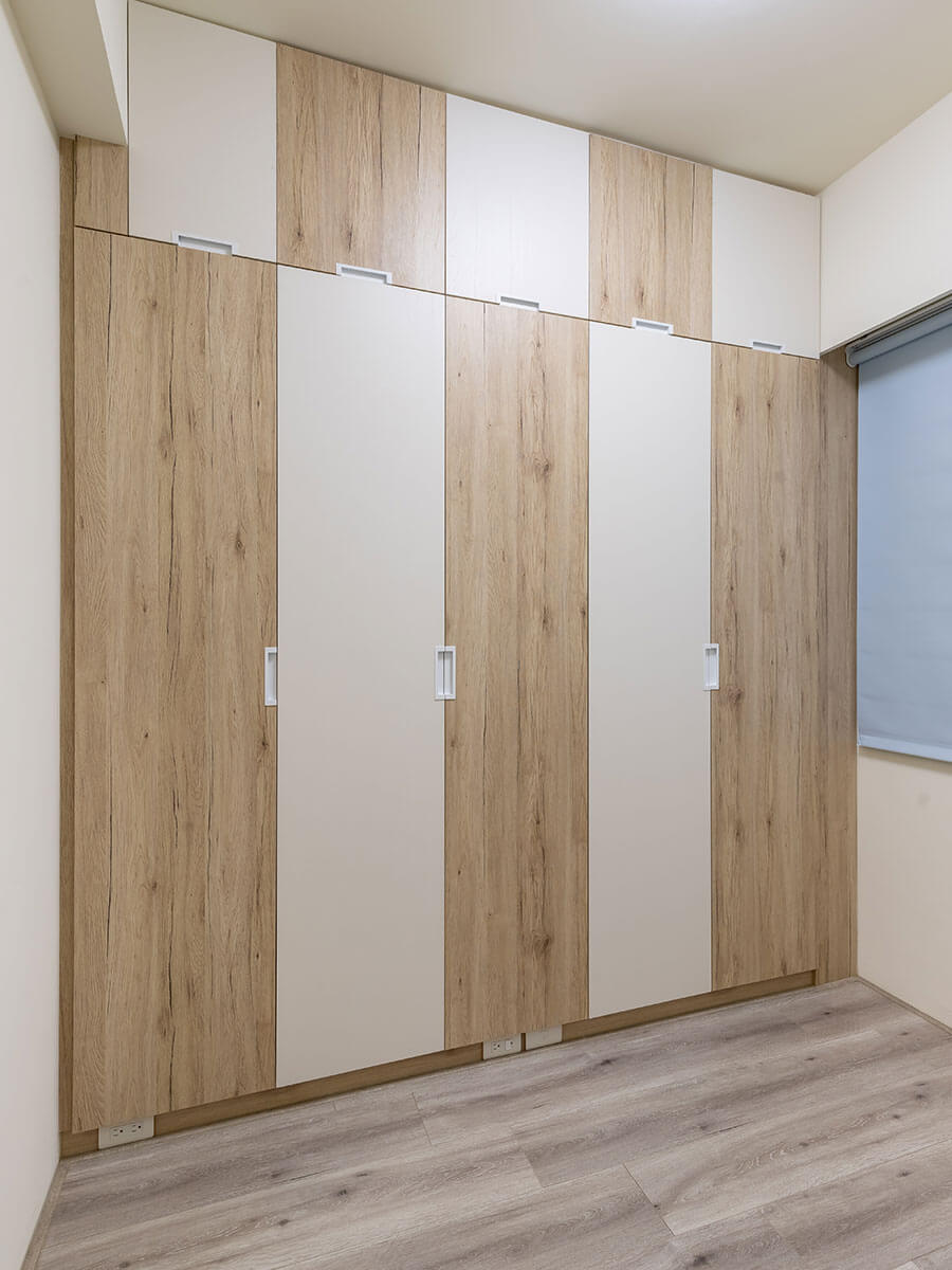 既是儲藏室,有條理的收納最重要,一排鑼帛白、白銓木雙色交錯的模組化系統衣櫃頂到最高處,隨時派上用場,另外,這間還可兼作備用客房,設想周到。